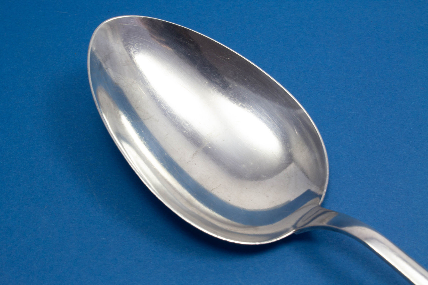 Dieser versilberte Gemüselöffel zeigt ein Hammerschlag-Dekor und kommt aus Dänemark.
