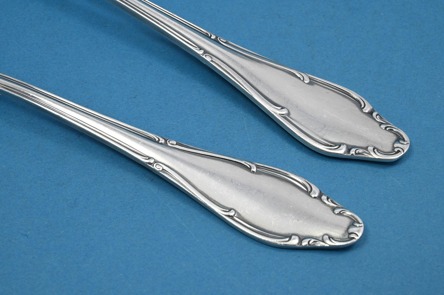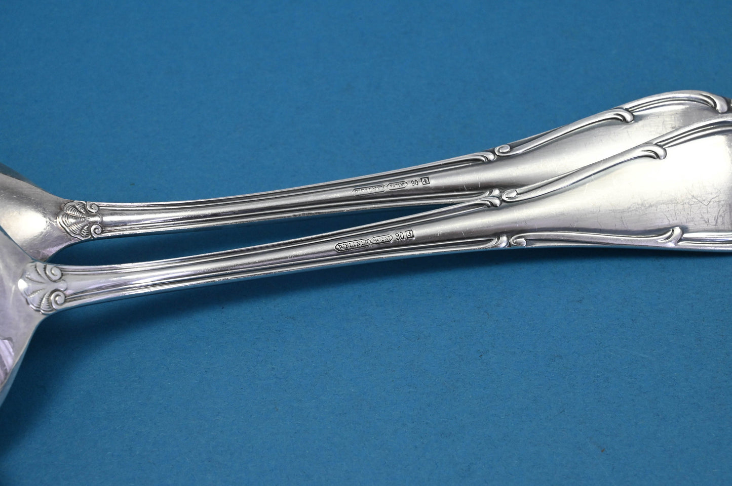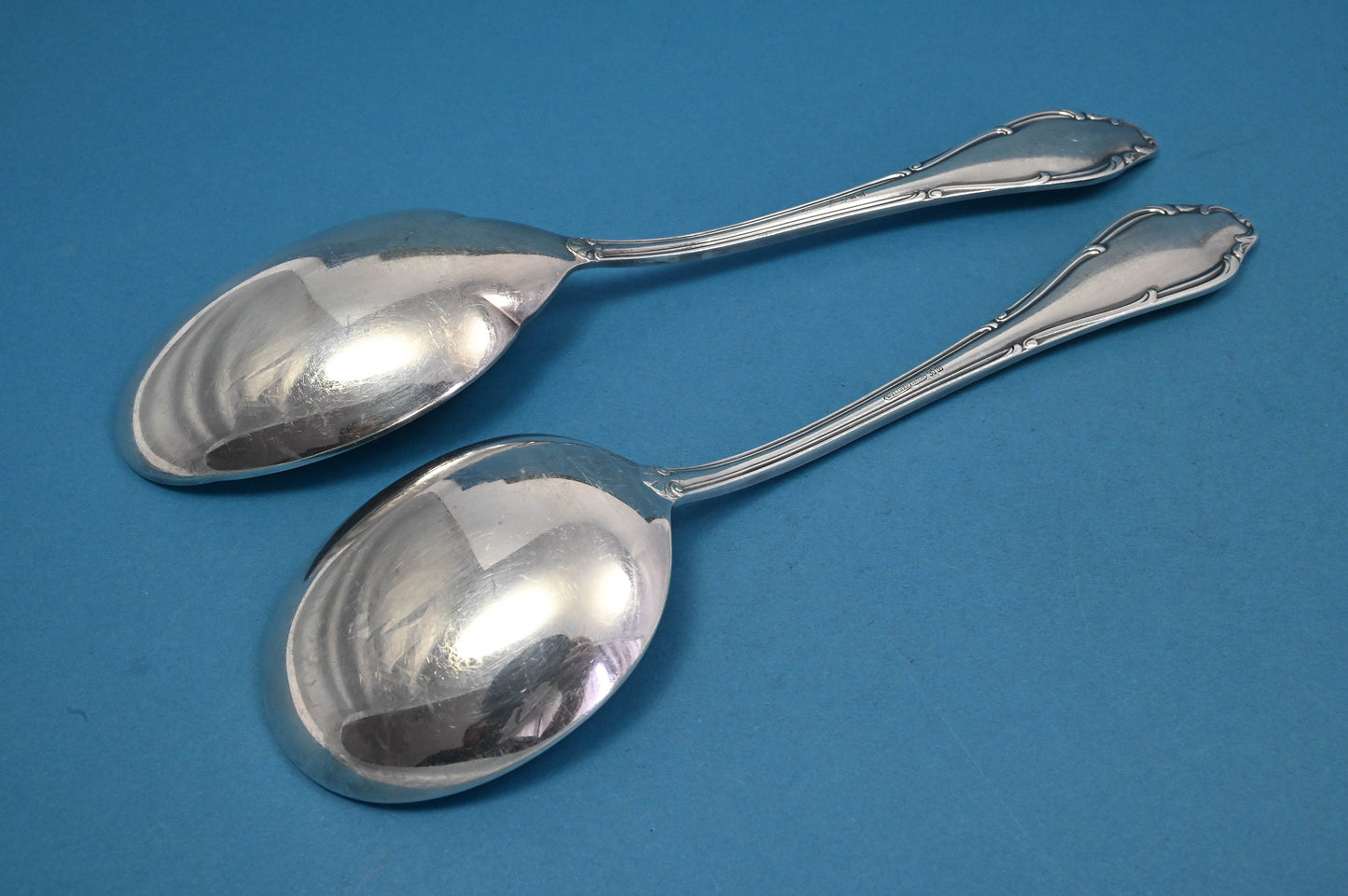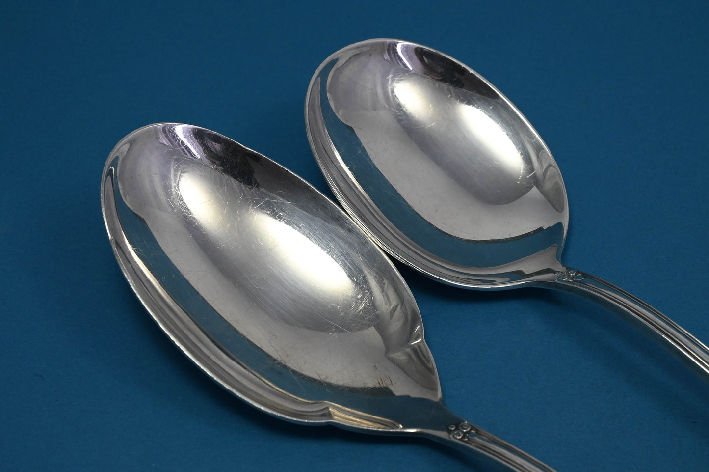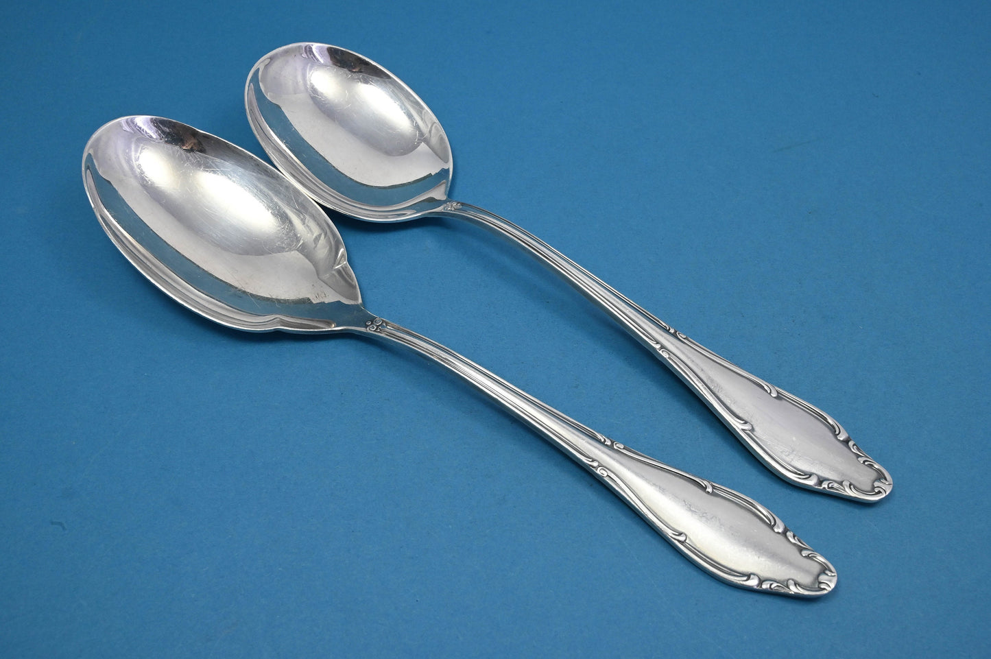 Ein großer, versilberter Gemüselöffel mit dem passenden Kartoffellöffel von Wellner mit dem beliebten Mozartmuster.