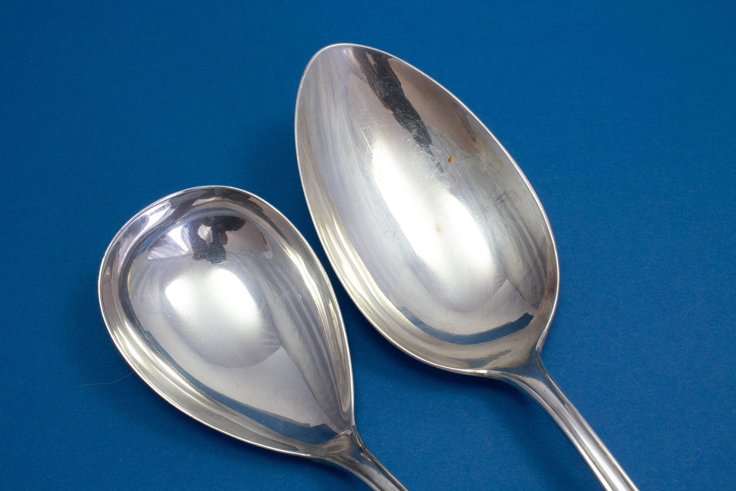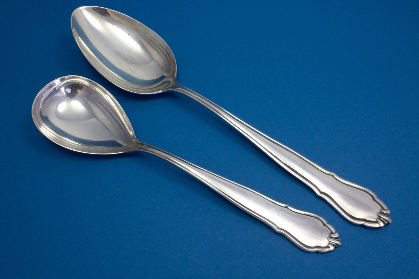 Ein großer, versilberter Gemüselöffel mit dem passenden Soßenlöffel.