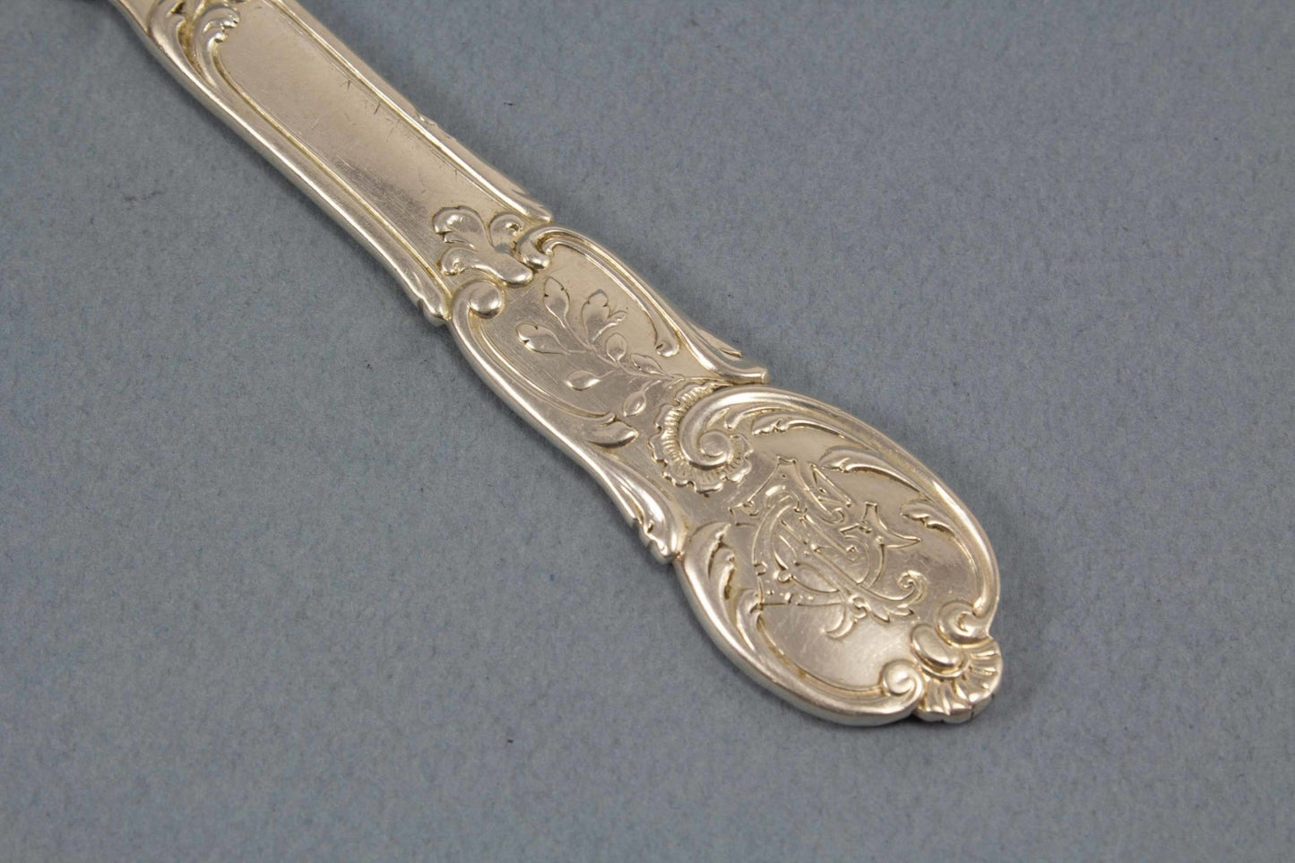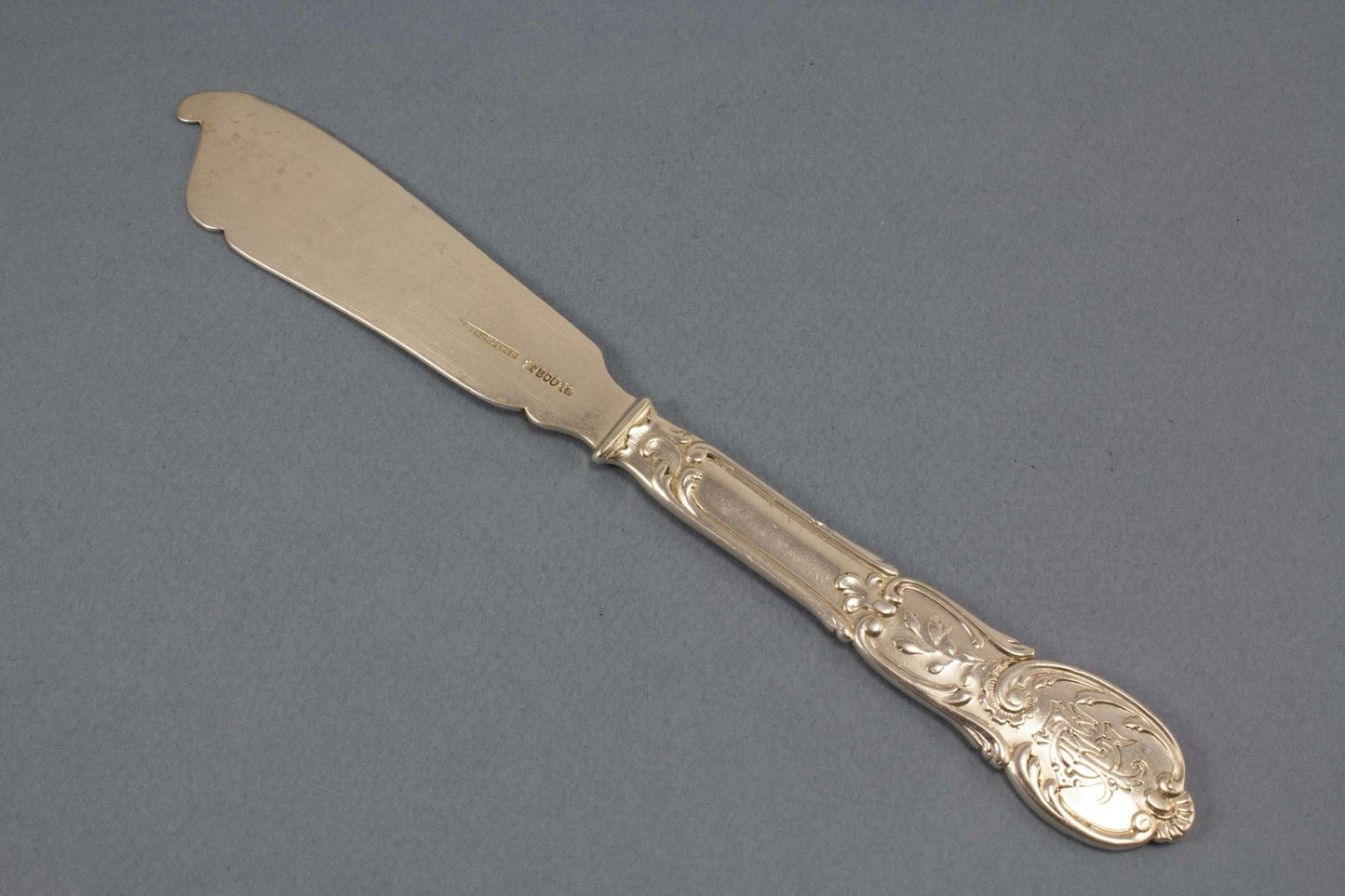 Ein sehr hübsches Käsemesser von Wilkens aus 800er Silber. Mit diesem Messer bist du bestens ausgestattet für deinen nächsten Brunch oder eine Brotzeit. Das Messer ist graviert mit FC.