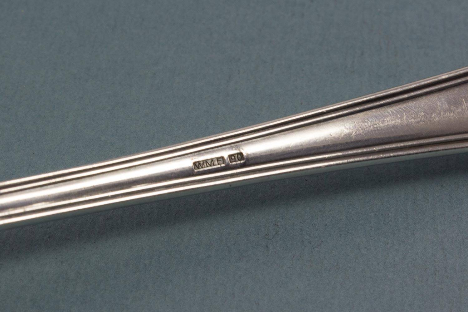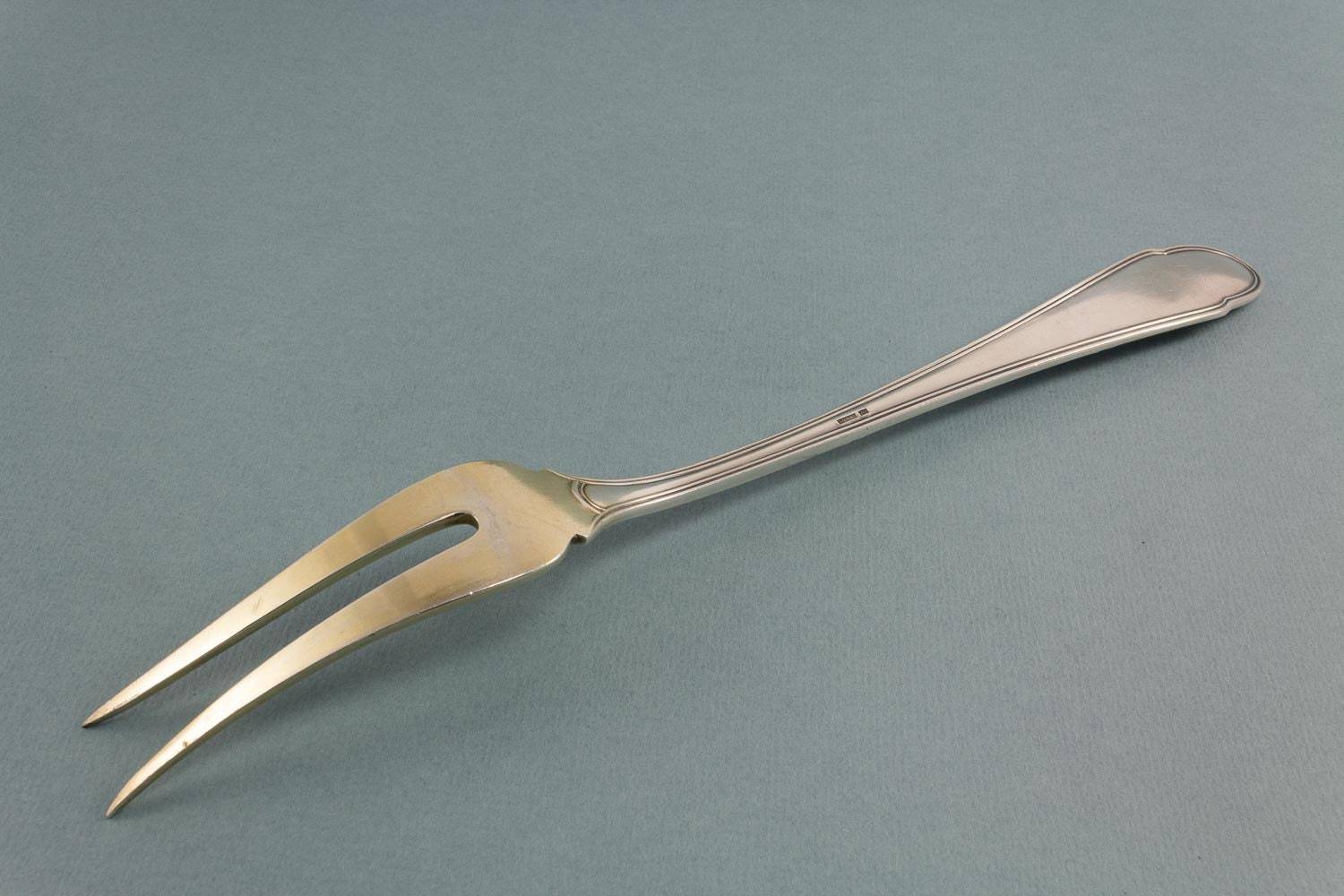 Eine antike und große Vorlegegabel oder Serviergabel von der Firma WMF. Die Gabel ist versilbert und zeigt das Dekor WMF 200 Kreuzband. Die Gabel stammt aus der Zeit um 1920.