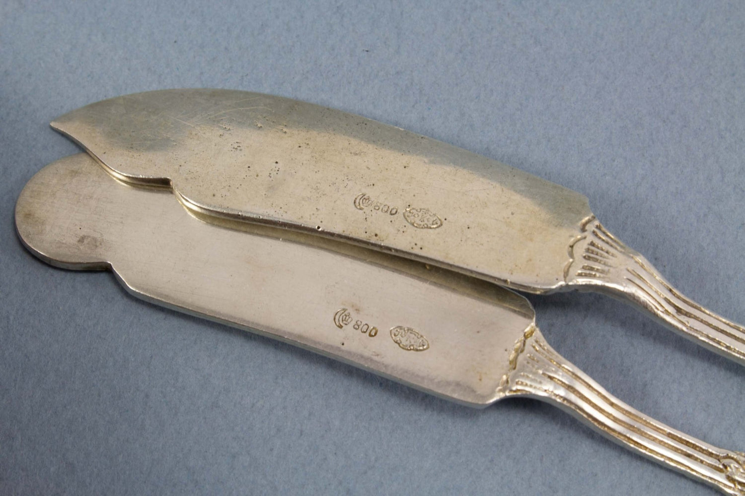 Sehr hübsches Silber- Set aus einem Käsemesser und einem Buttermesser mit feinem Puttimuster. Beide Messergriffe ziert ein kleines Engelchen, die Messer bestehen aus 800er Silber.