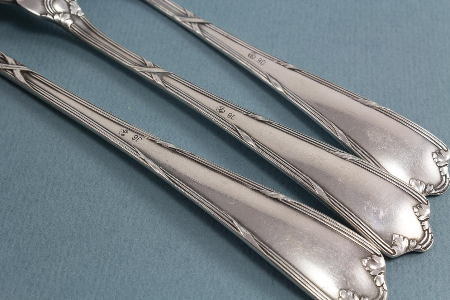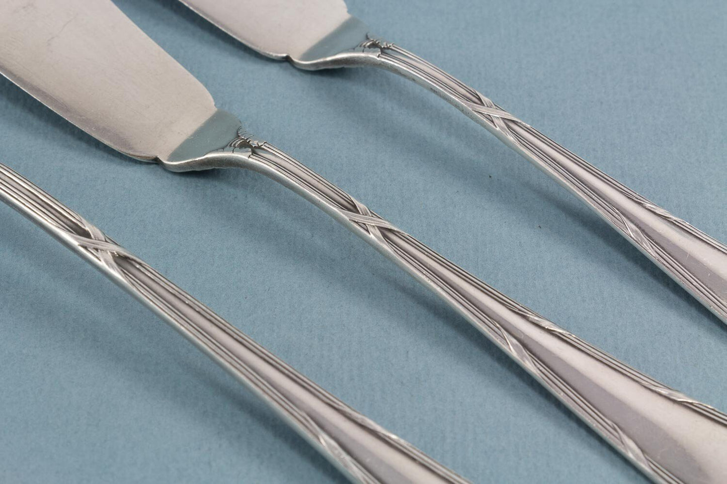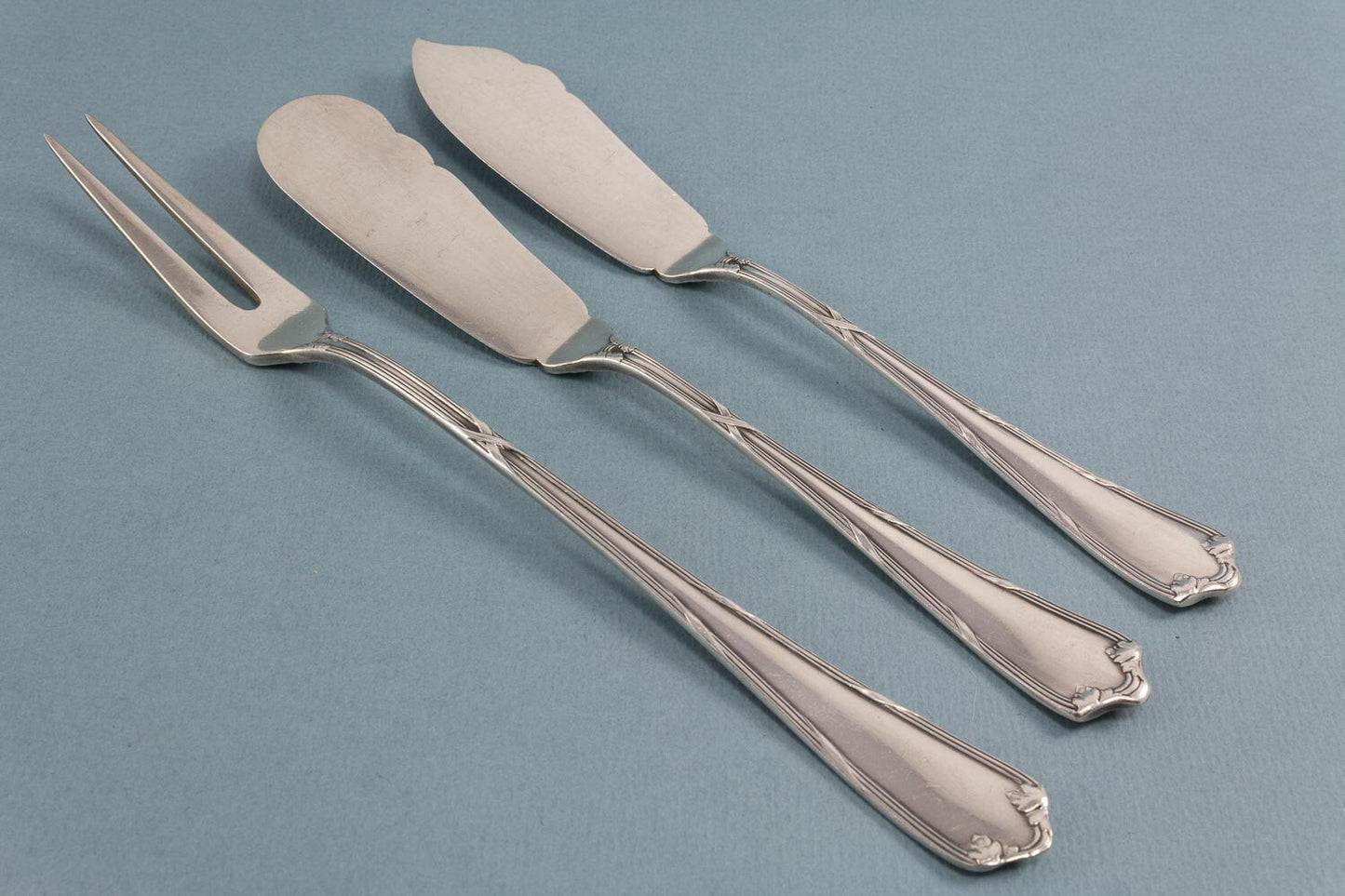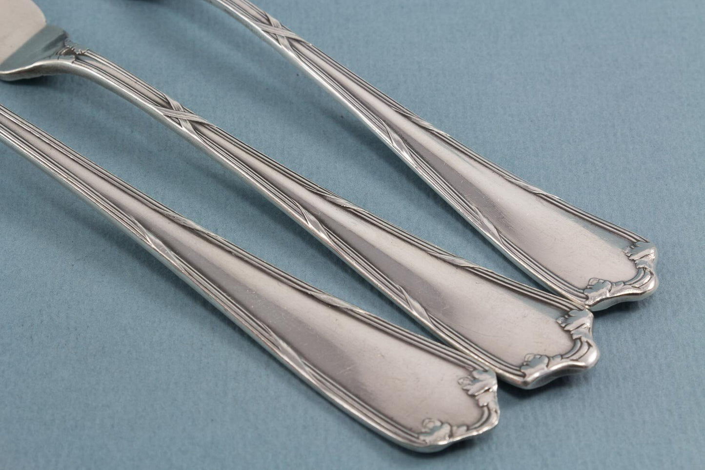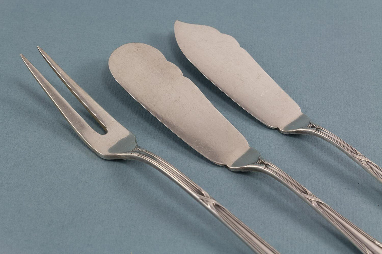Tolles Jugendstil Besteck mit einem beeindrucken Kreuzband-Dekor von Koch und Bergfeld. Dieses Set besteht aus Buttermesser, einem Käsemesser und einer Wurst- oder Käsegabel. Mit diesen drei passenden Besteckteilen bist du bestens ausgestattet für Brotzeit, Brunch oder ein gemütliches Sonntagsfrühstück. Ein solches Set sollte auf keiner Antipasti- oder Käseplatte fehlen. Nützlich und außergewöhnlich dekorativ ist dieses seltene Besteck-Set aus den 1920er Jahren.