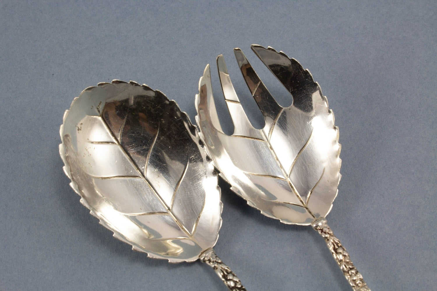 Dieses wunderschöne und kleine Salatbesteck wurde aus 800er Silber hergestellt. Beide Besteckteile, Salatlöffel und Salatgabel, ziert ein süßer Putto. Beide Teile wurden aufwendig von Hand mit Jugendstil-Ornamenten ziseliert. Edle, seltene Stücke von Christoph Widmann perfekt zu festlichen Gelegenheiten.
