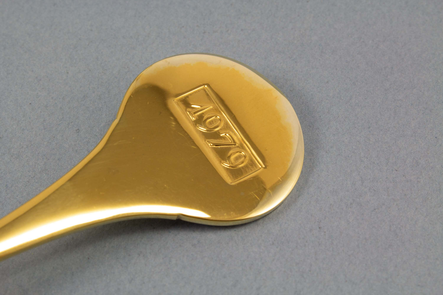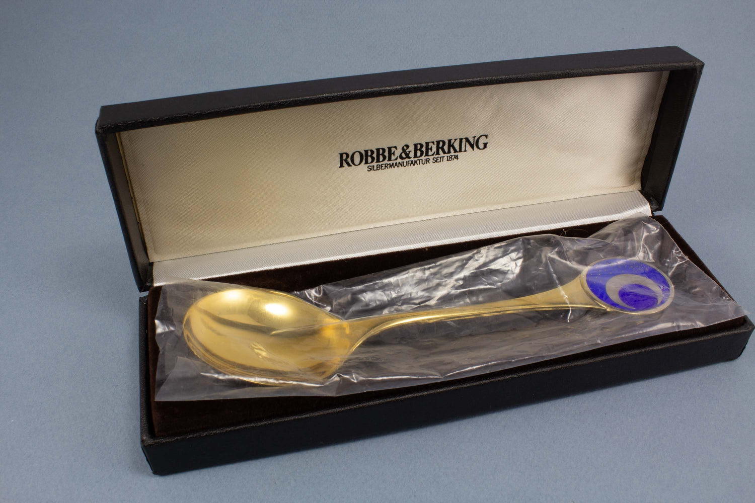 A noble, silver spoon of the year by Robbe and Berking from 1979. The Robbe & Berking spoons of the year are collector's items of high artistic and material value. The spoon was forged from 925 Serling silver and plated with hard gold. Since 1969 a new model has been published every year in a strictly limited world edition. The elaborate motifs are enamelled by hand.