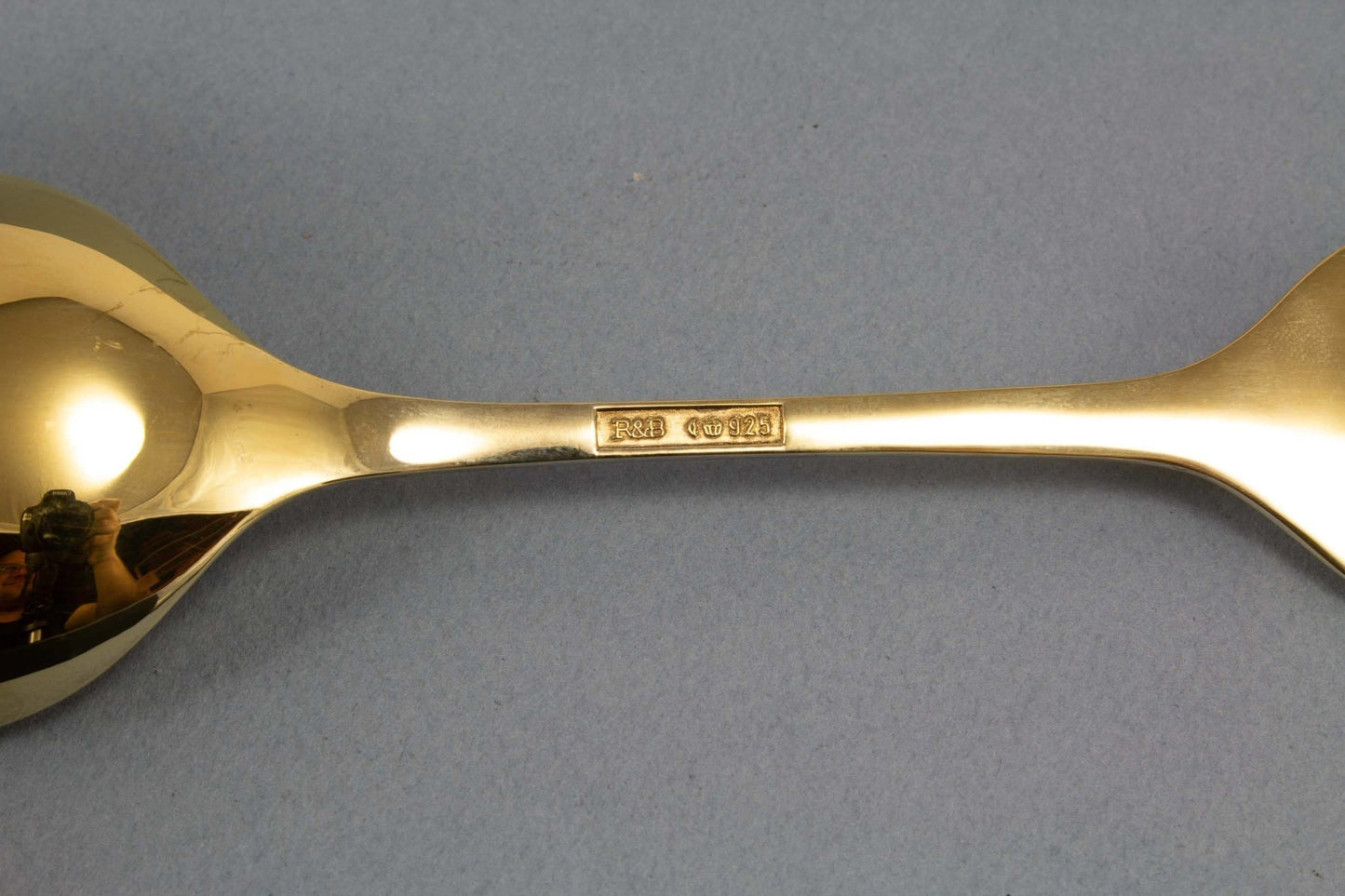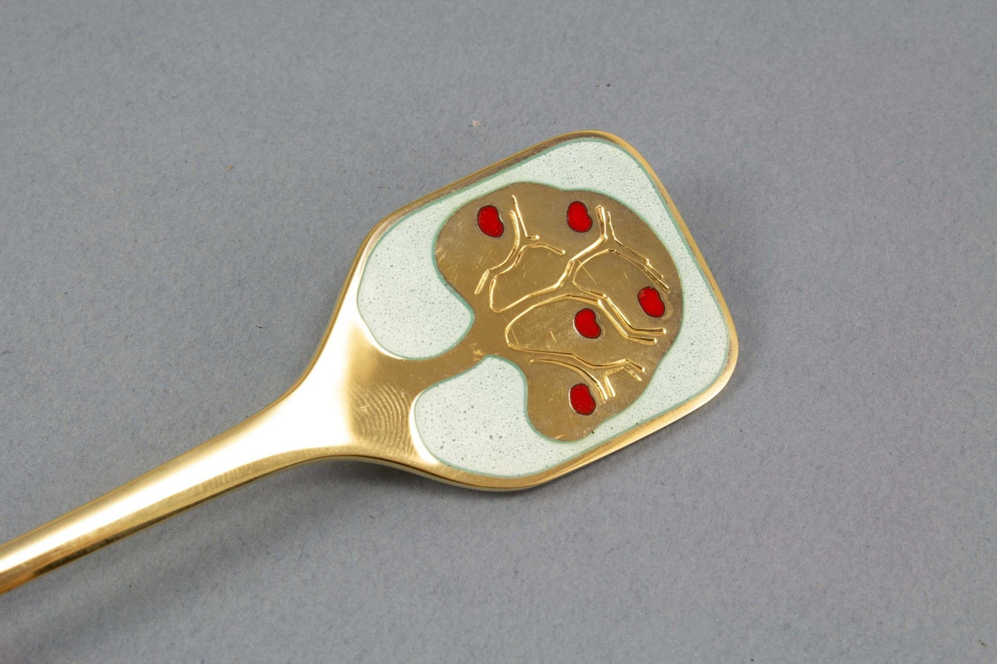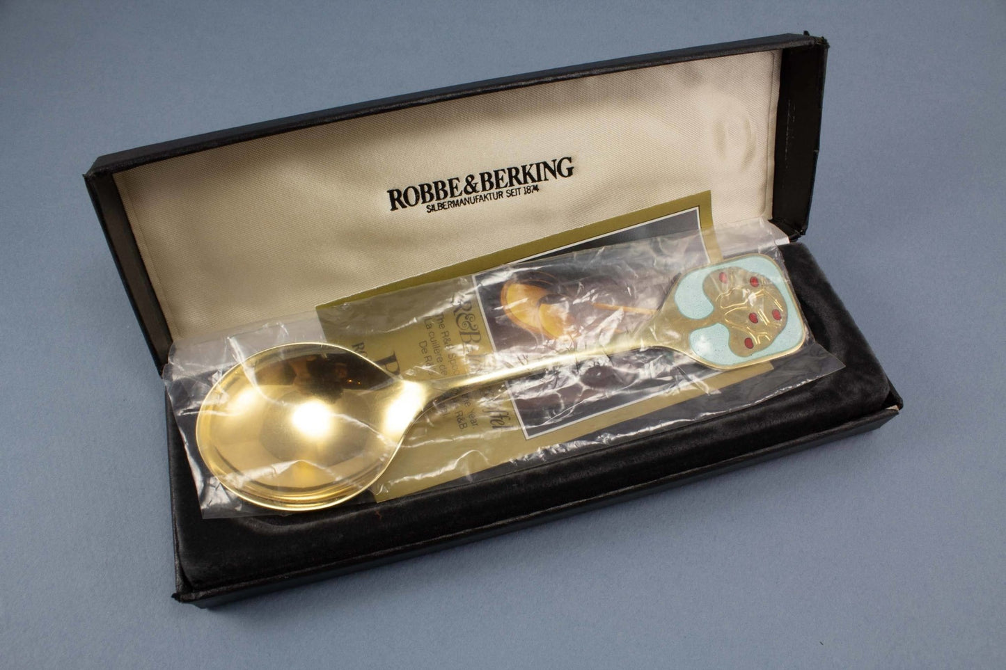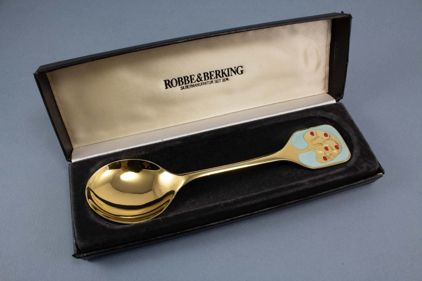 Ein edler, silberner Jahreslöffel von Robbe und Berking aus dem Jahr 1982. Die Robbe&Berking Jahreslöffel sind Sammlerobjekte von hohem künstlerischen und materiellen Wert. Der Löffel wurde aus 925er Serling-Silber geschmiedet und zusätzlich hartgoldplattiert. Seit 1969 erscheint jährlich ein neues Modell in streng begrenzter Weltauflage. Die aufwendigen Motive werden von Hand emailliert.