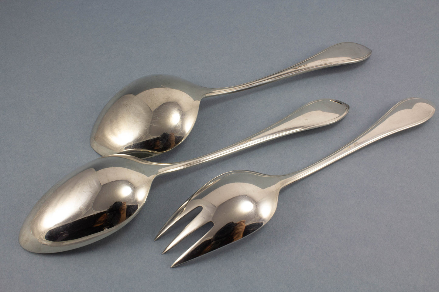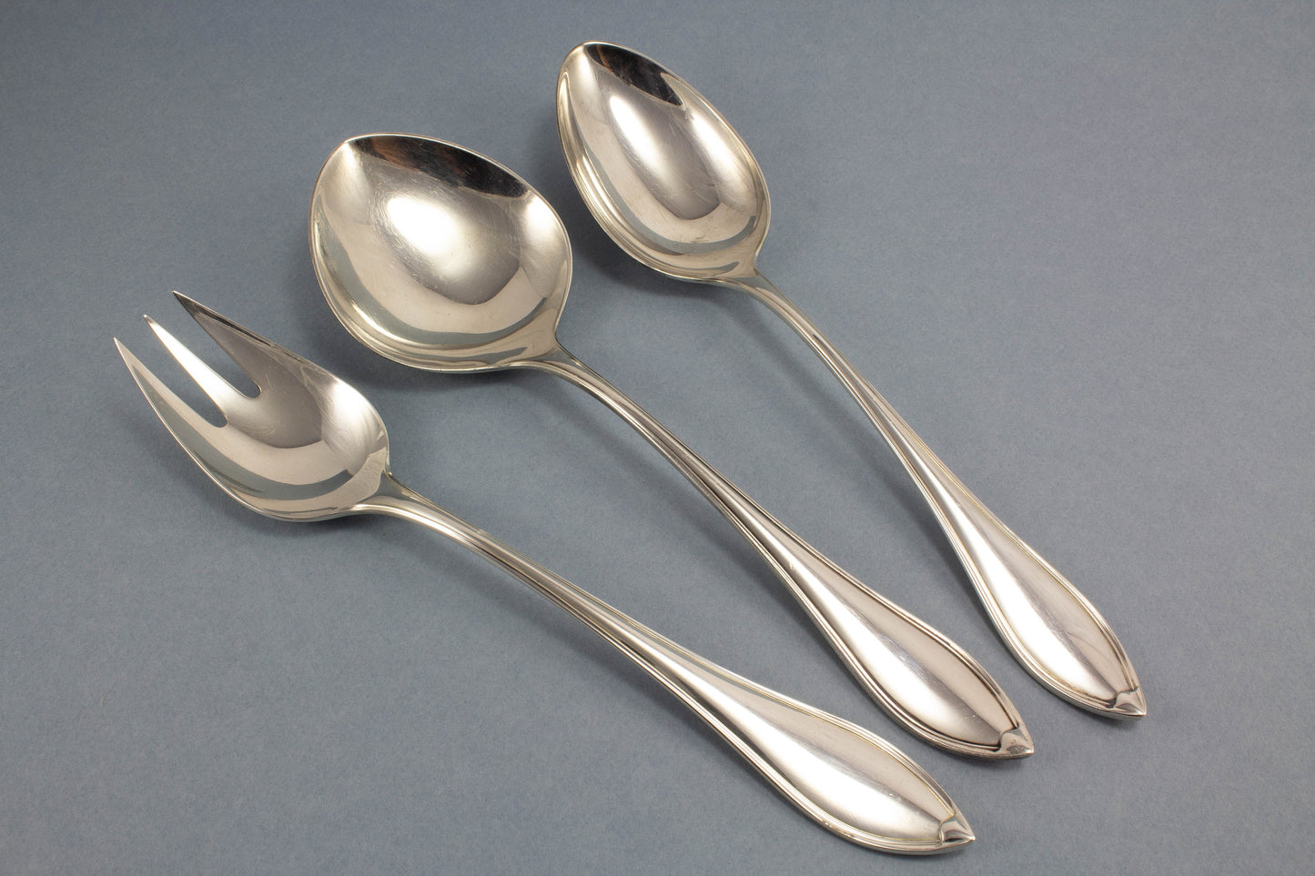 Ein edles dreiteiliges Servierset von Robbe und Berking im zeitlosen Navette-Dekor. Das Set besteht aus einem Gemüselöffel, einer Gemüsegabel und einem Kartoffellöffel.