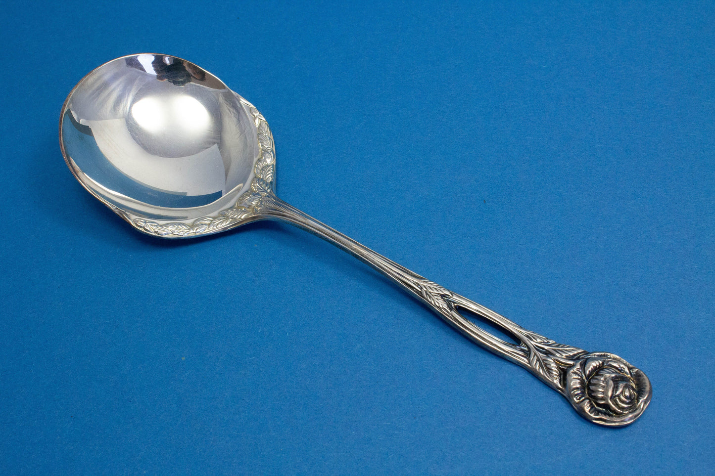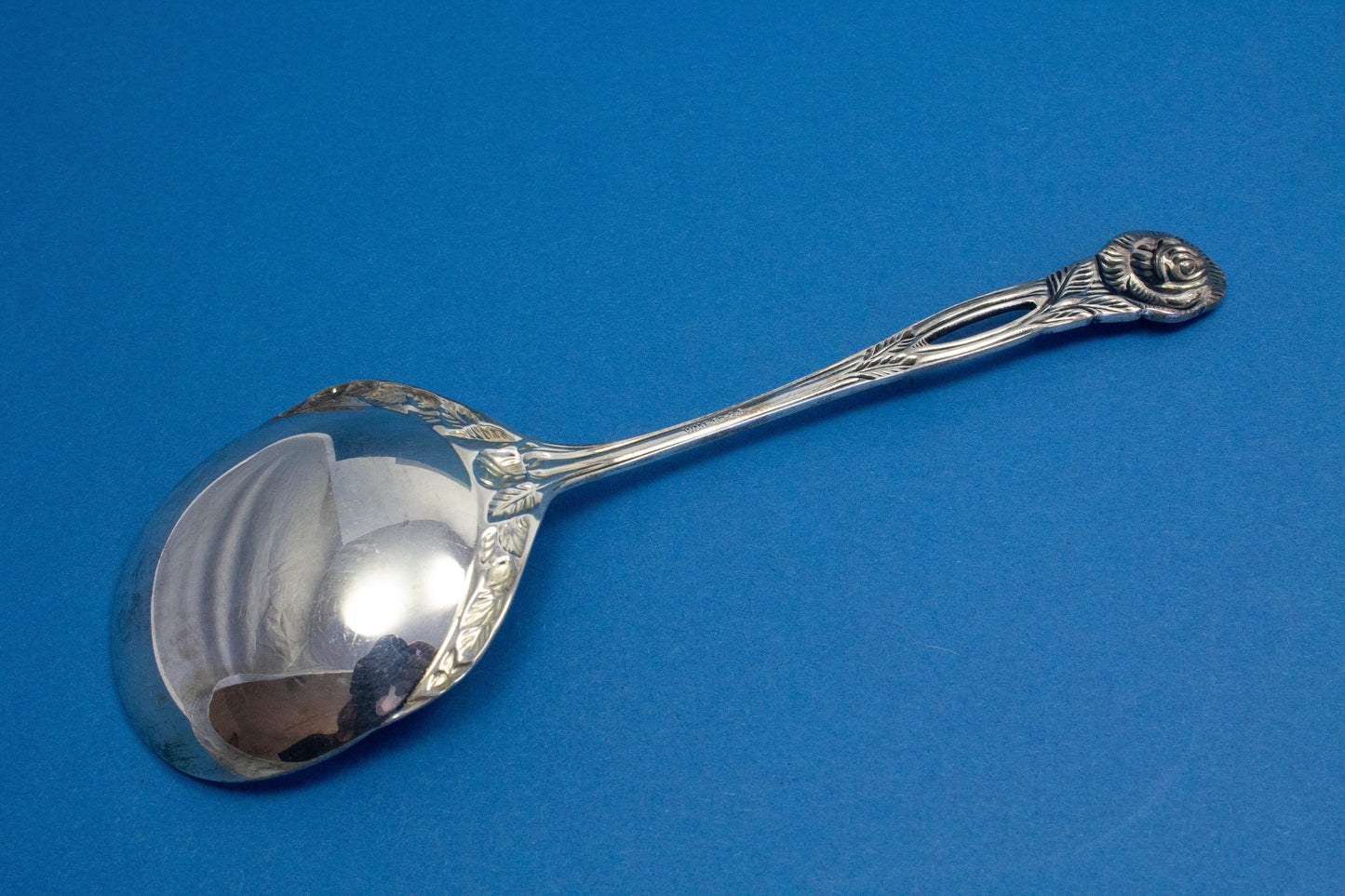 Ein Sahnelöffel mit Rosendesign von WMF. Der edle Löffel mit der Hildesheimer Rose ist versilbert und seine große Schale bietet viel Platz. Ein besonderer Sahnelöffel für eine schöne Tafel.
