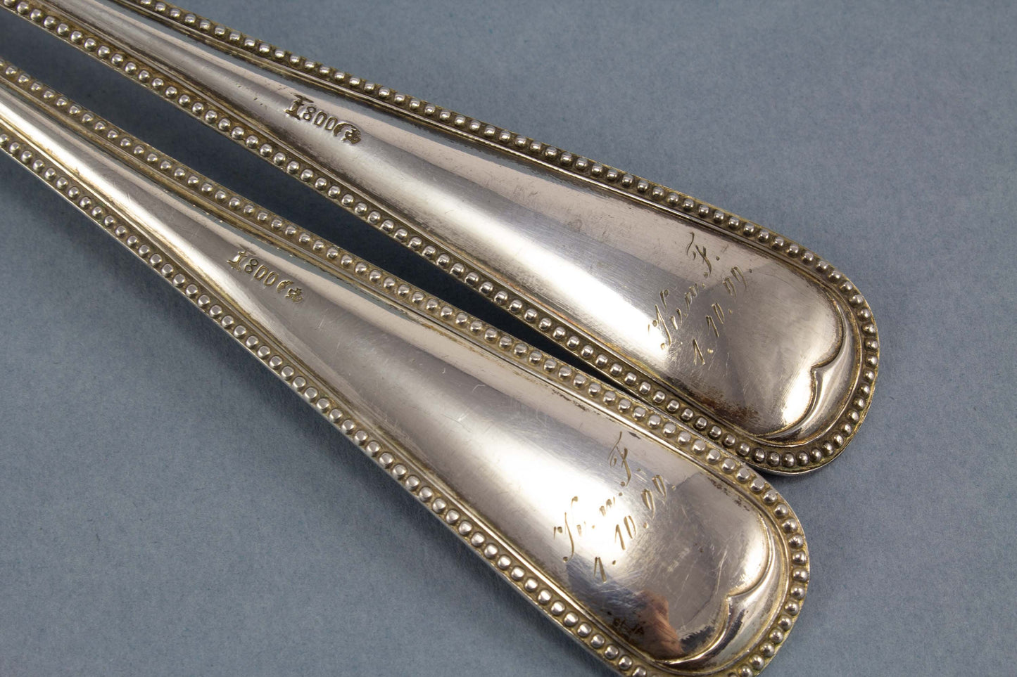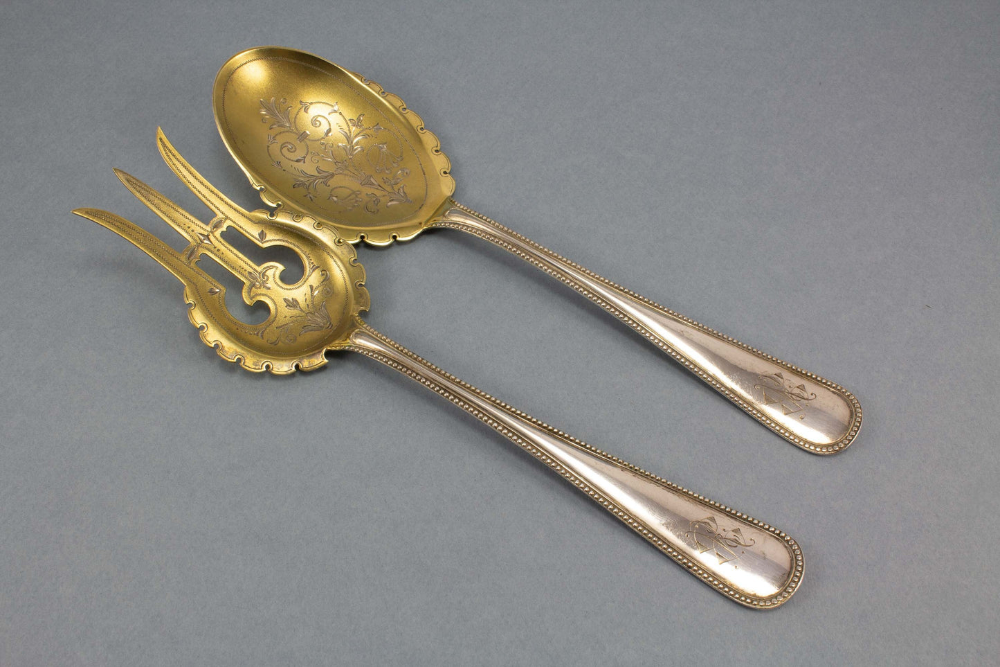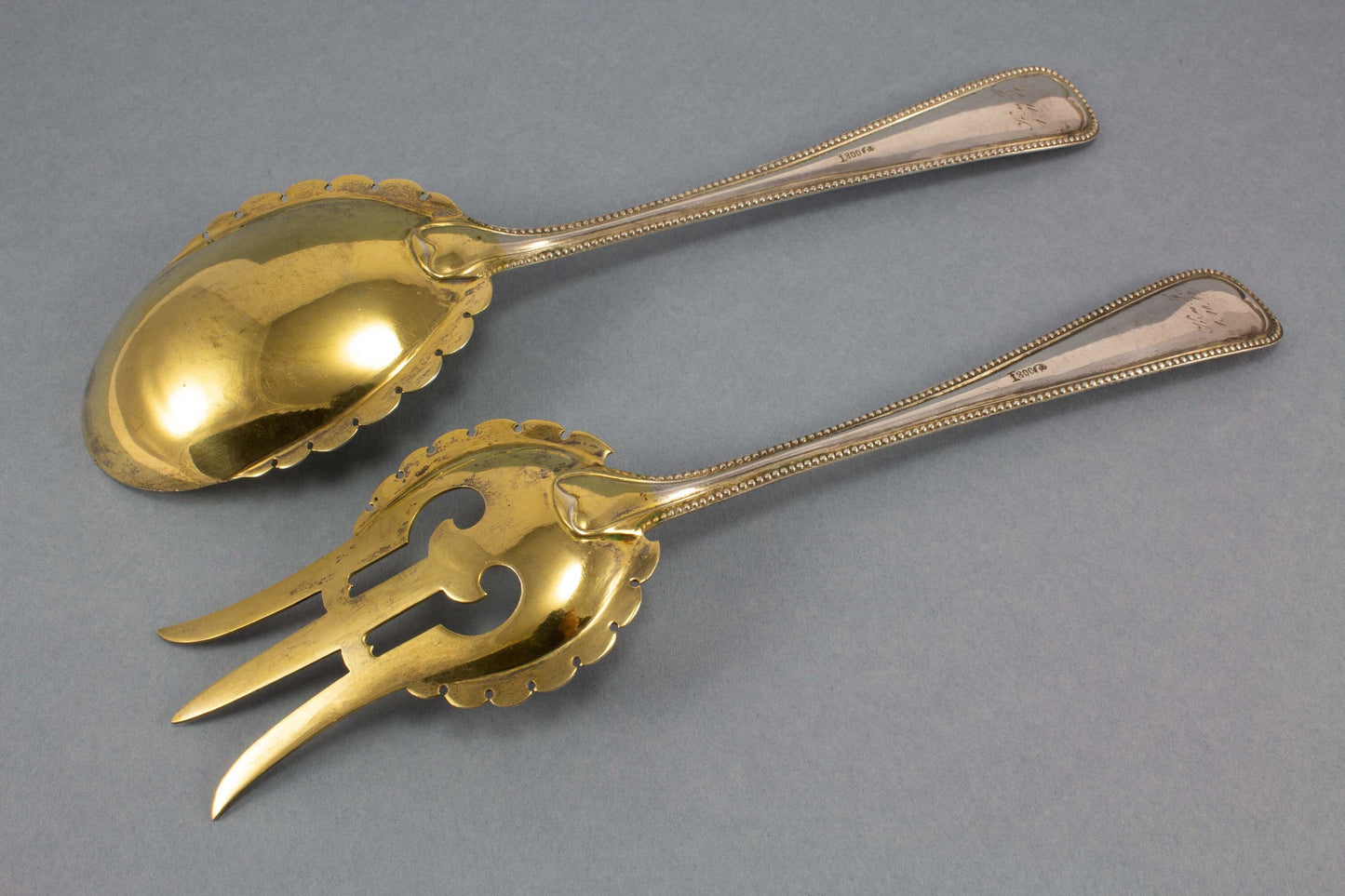 Beide Besteckteile Salatlöffel und Salatgabel sind mit einem edlen Perlbordüren-Muster verziert.