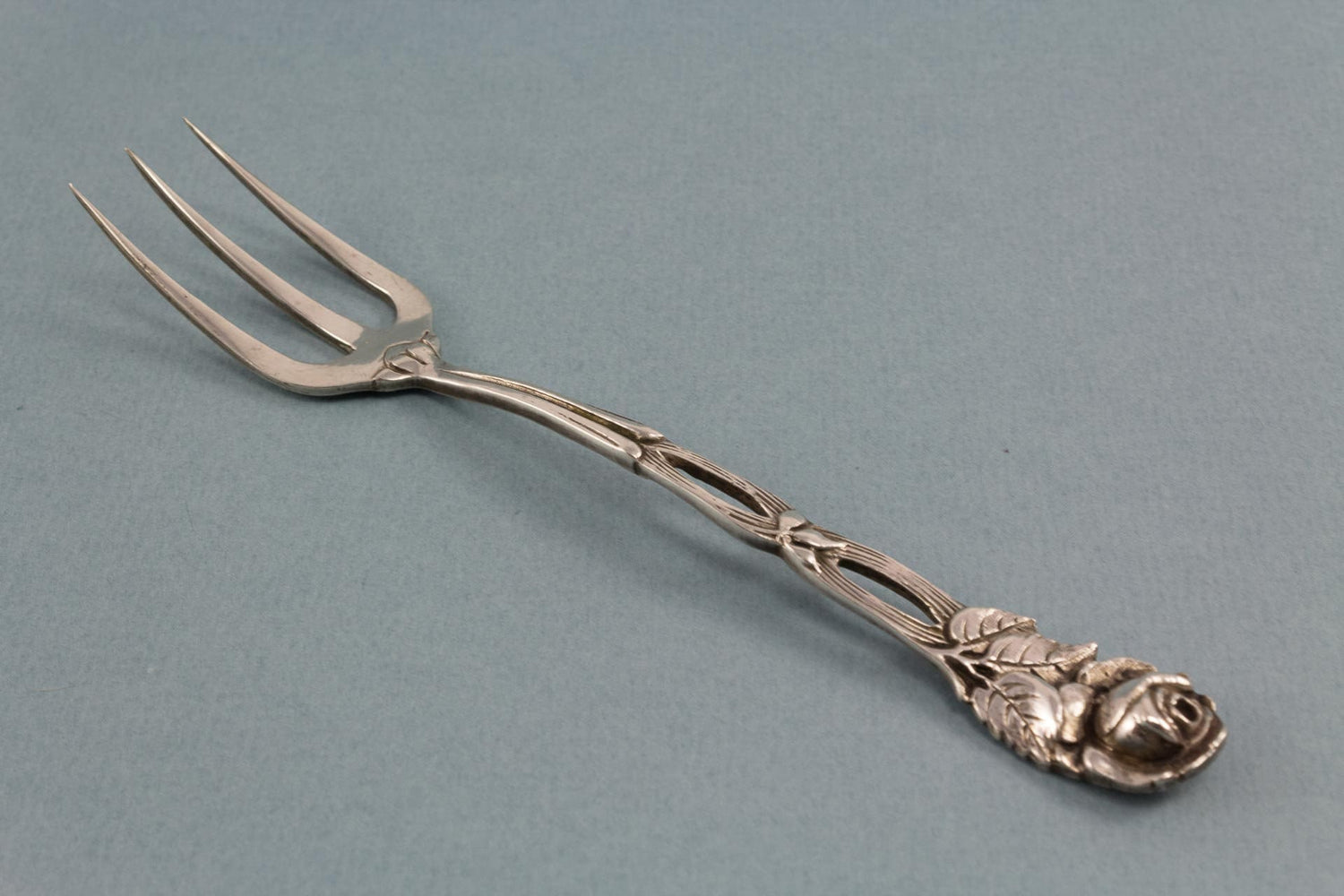 Die kleine Silbergabel zeigt am Griff ein aufwendiges Rosendekor.