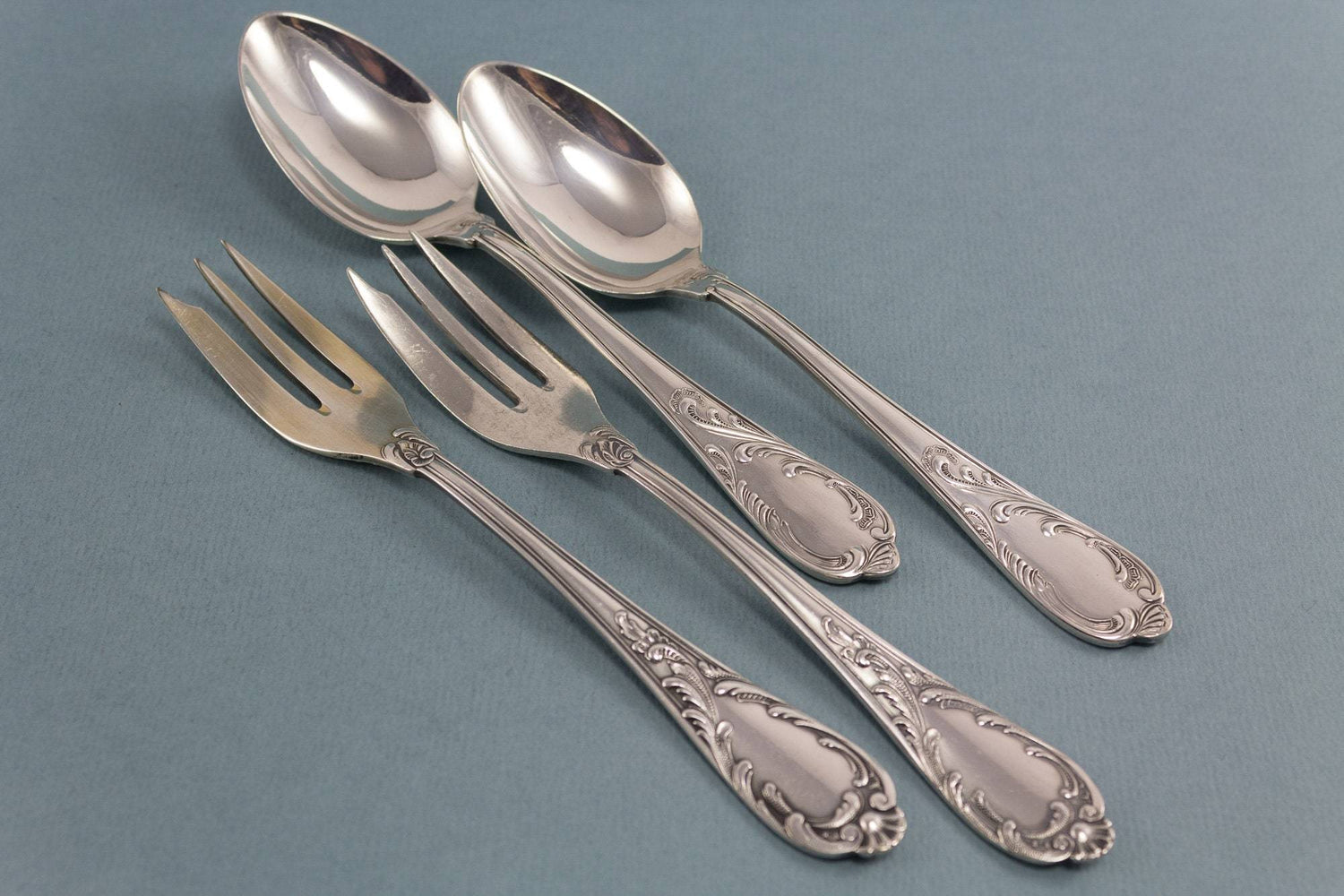 Schönes versilbertes Tea Time Set für 2, Mix and Match, Kuchengabeln, Teelöffel, Mokkalöffel