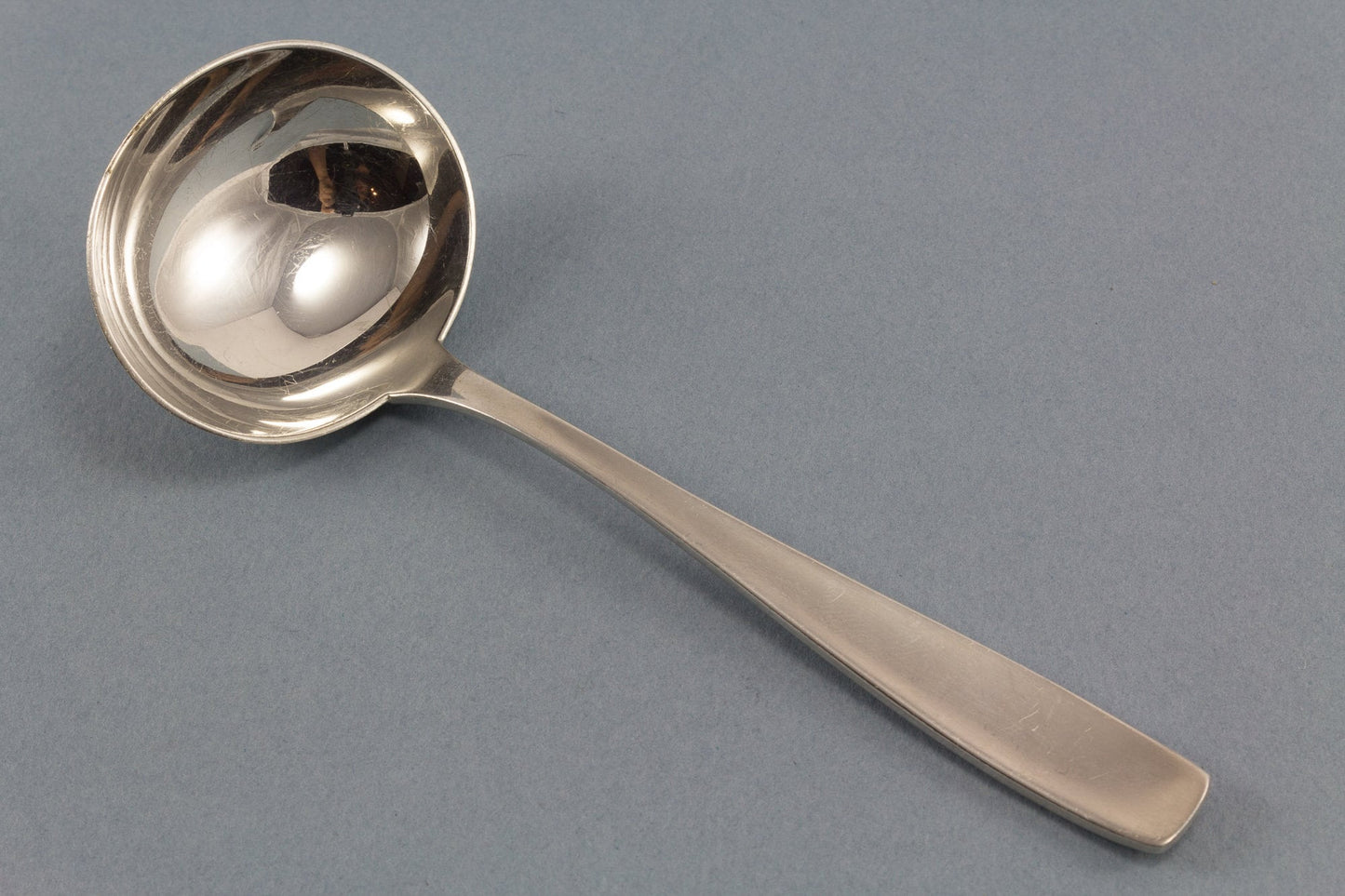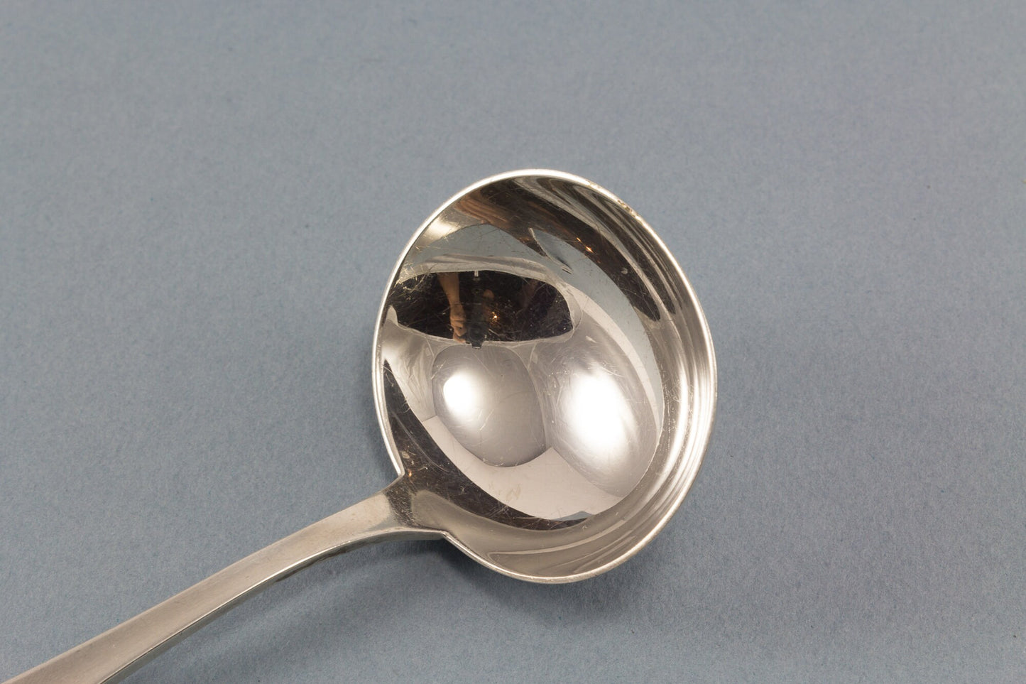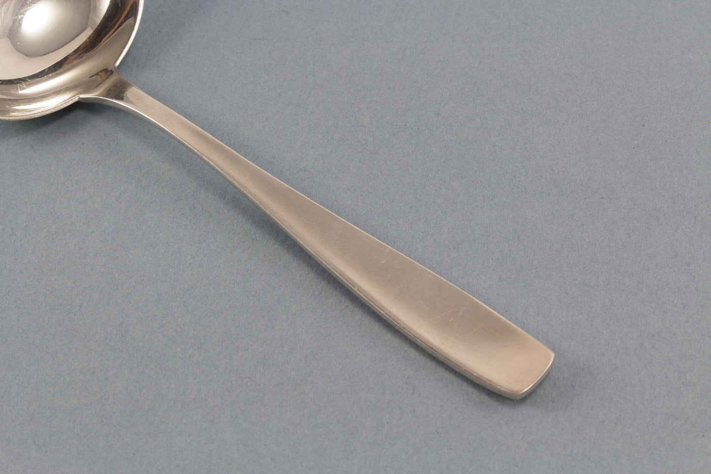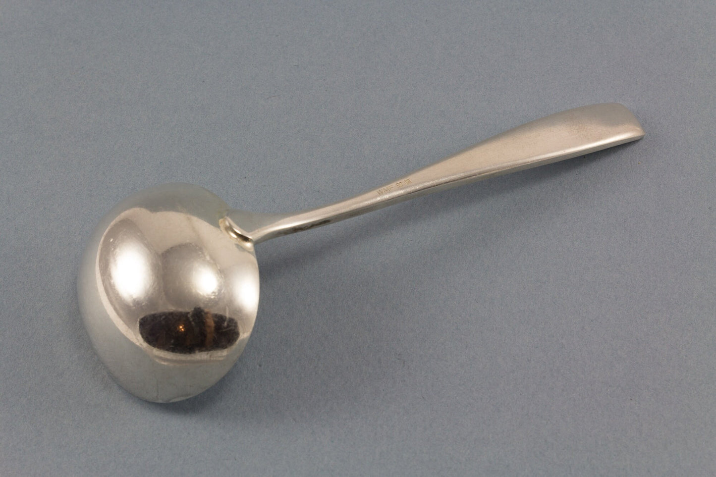Eine versilberte Soßenkelle mit einem hübschen Muster.