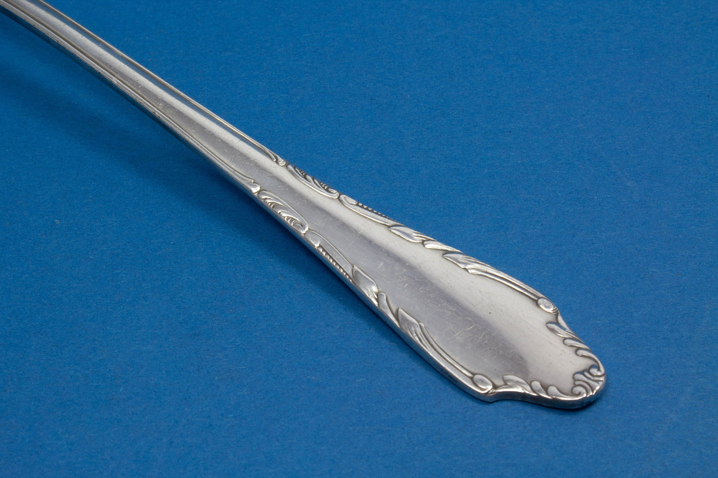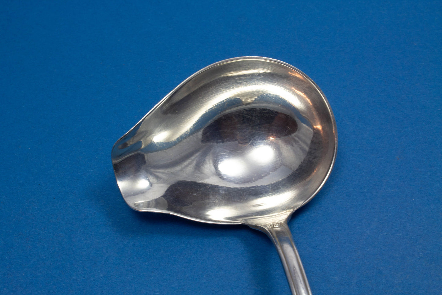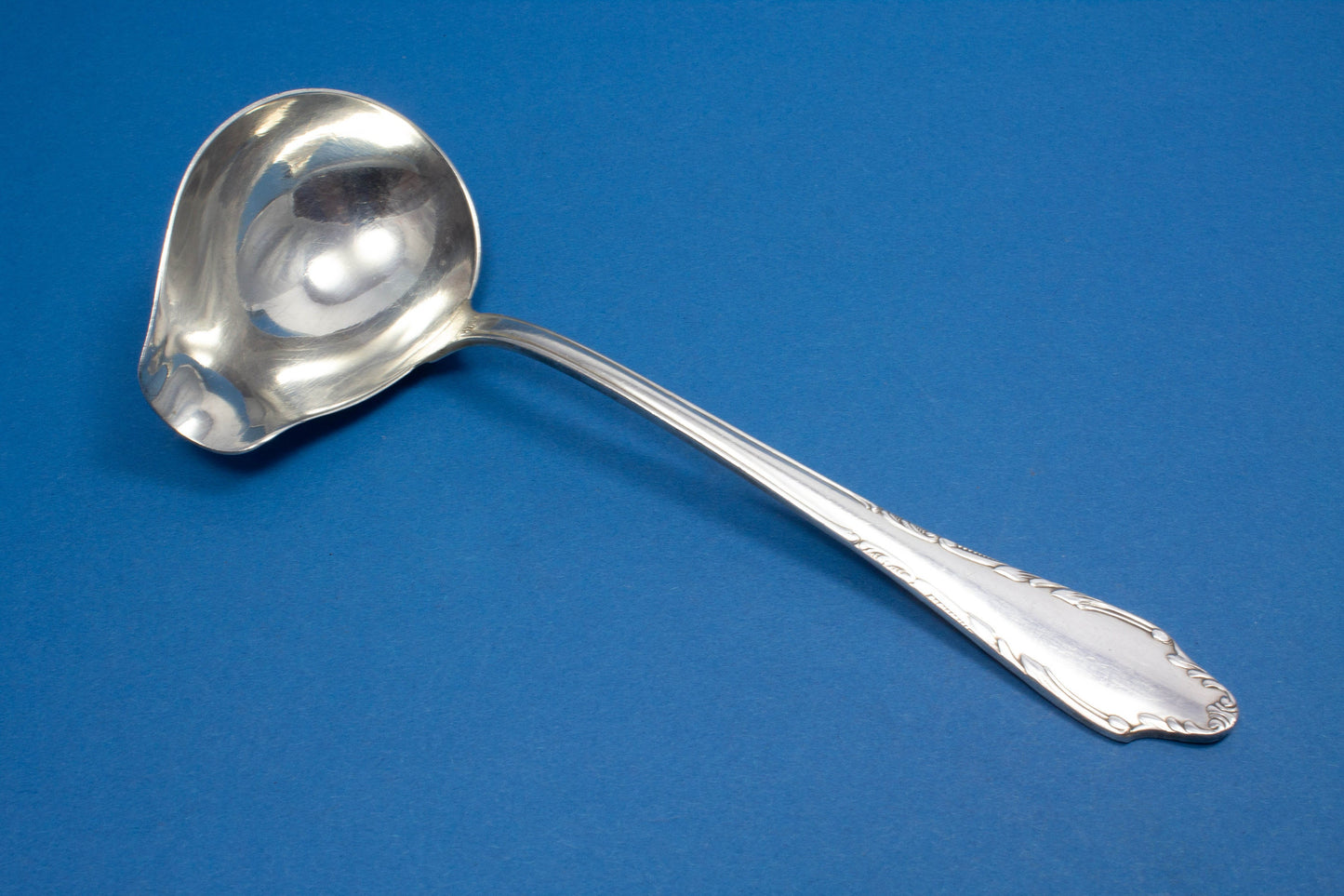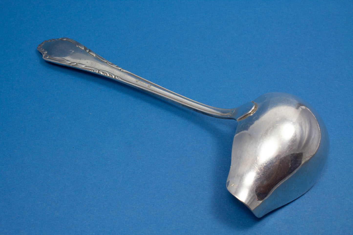 Eine versilberte Soßenkelle mit einem hübschen Muster.