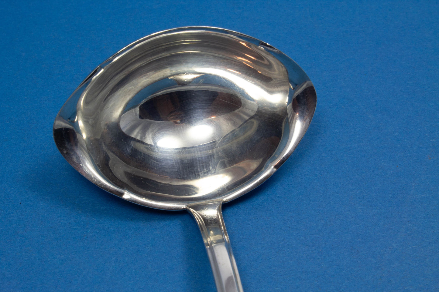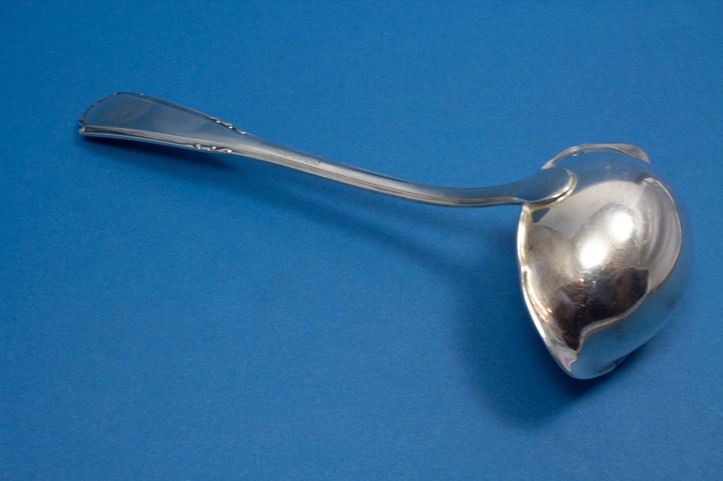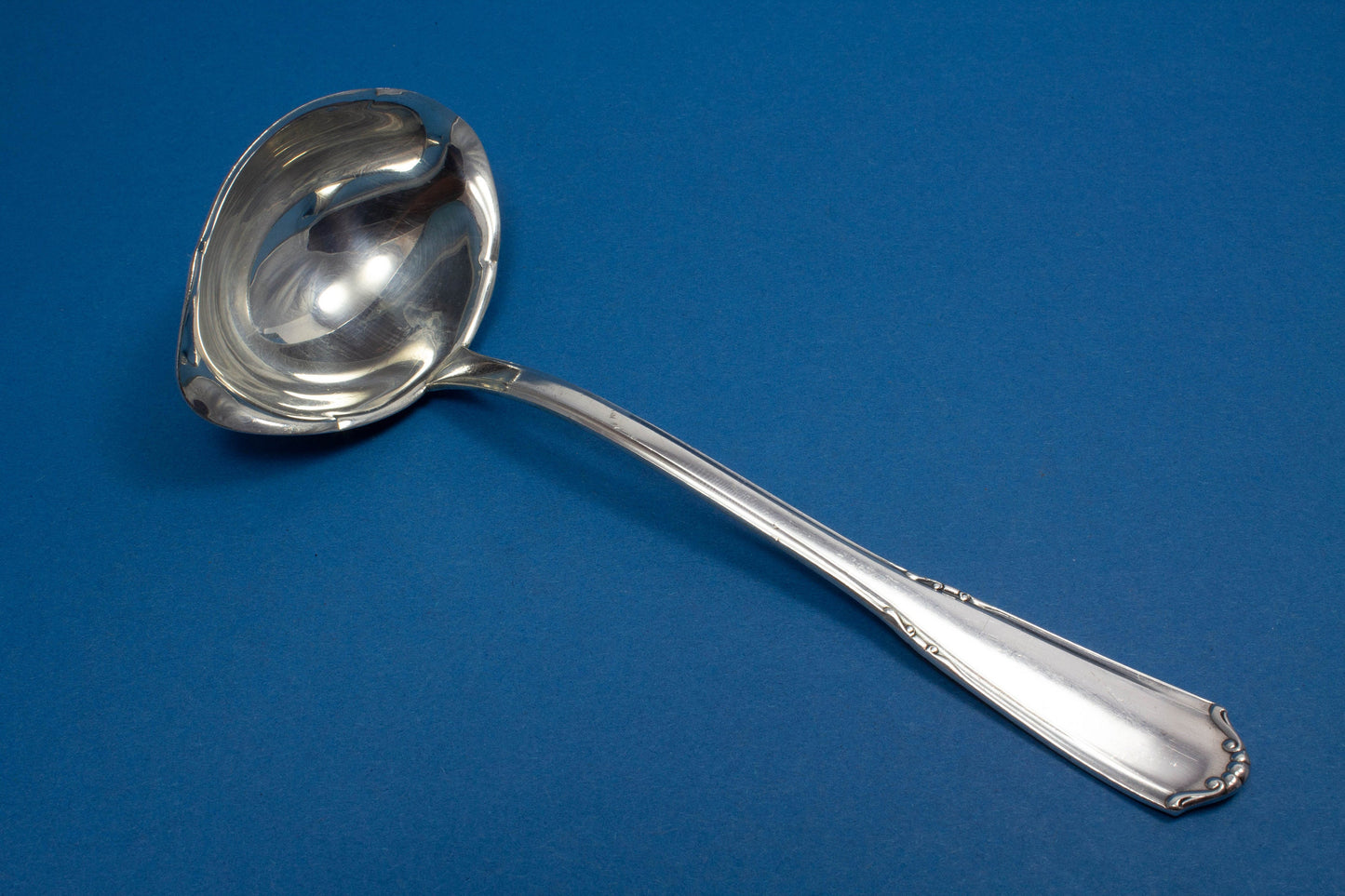 Eine versilberte Soßenkelle mit einem hübschen Muster.
