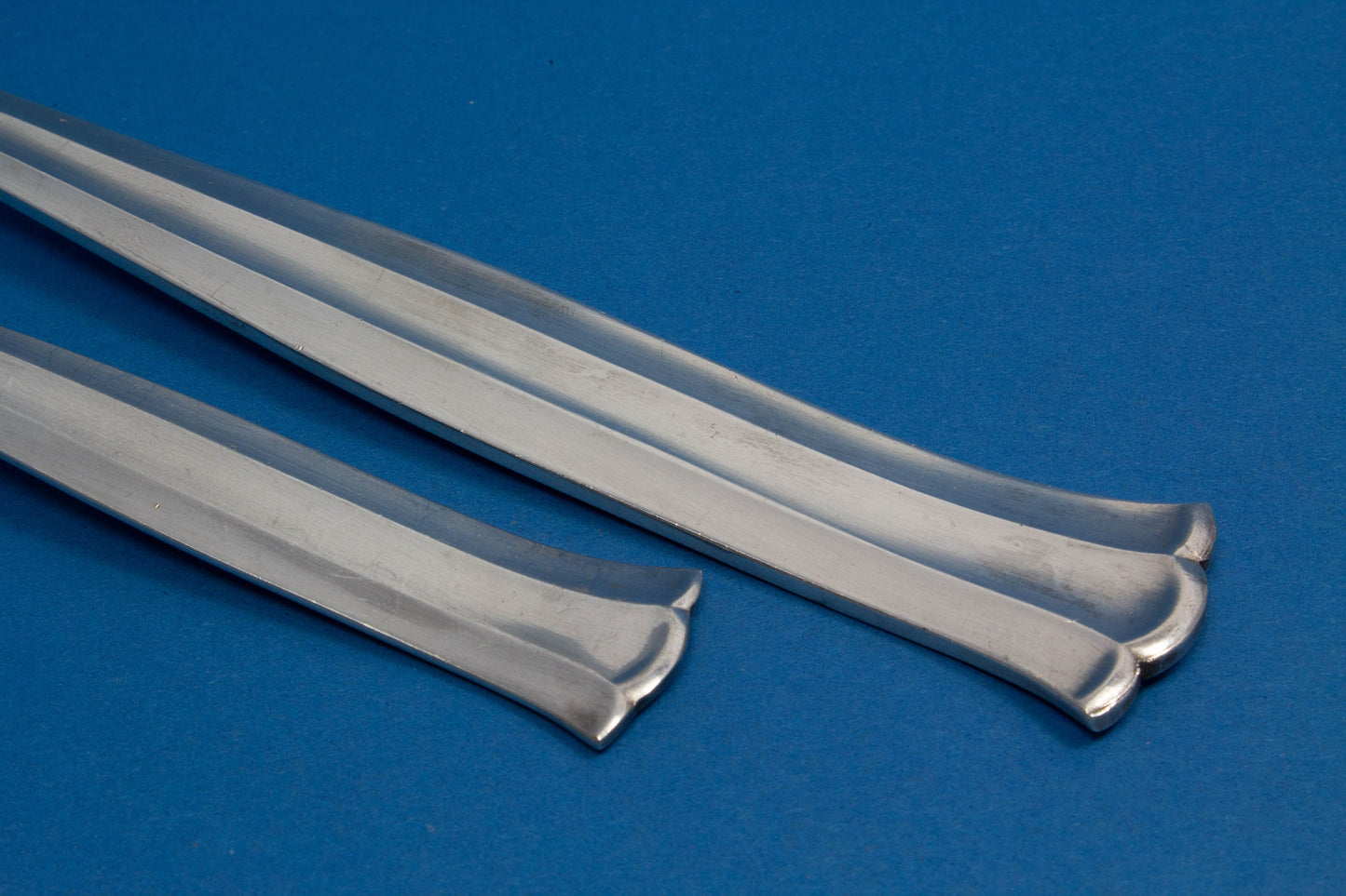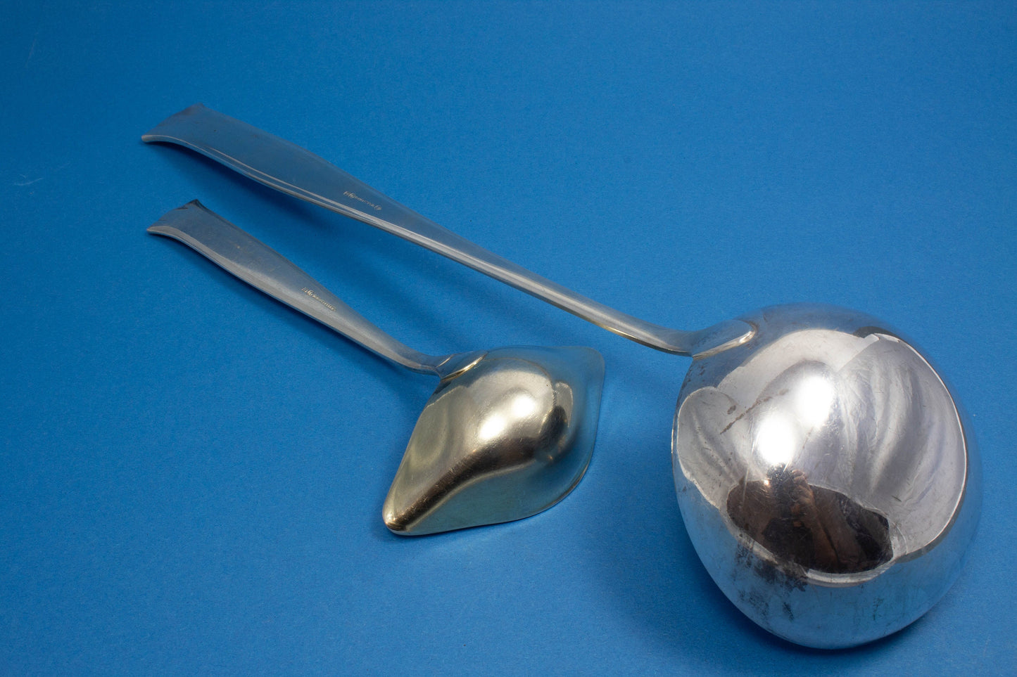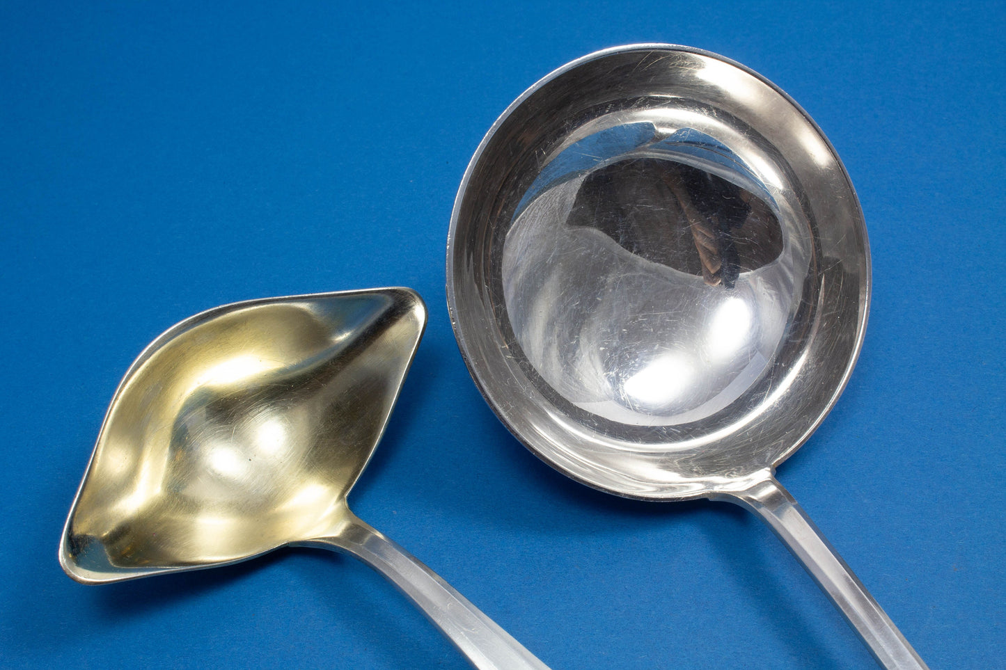 Eine versilberte Soßenkelle mit einem hübschen Muster.