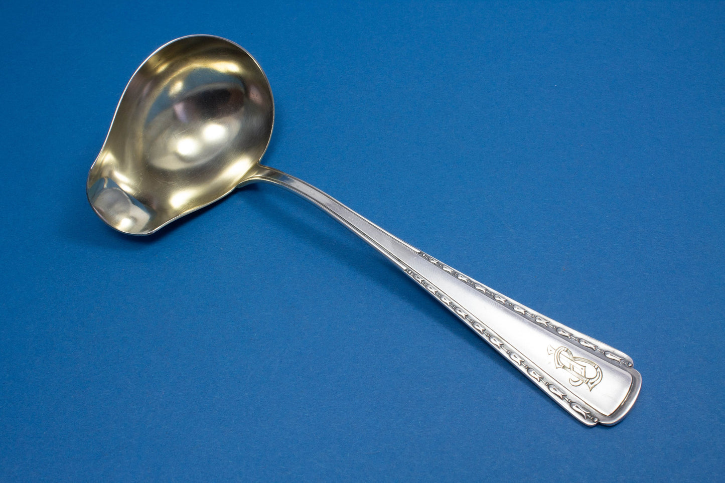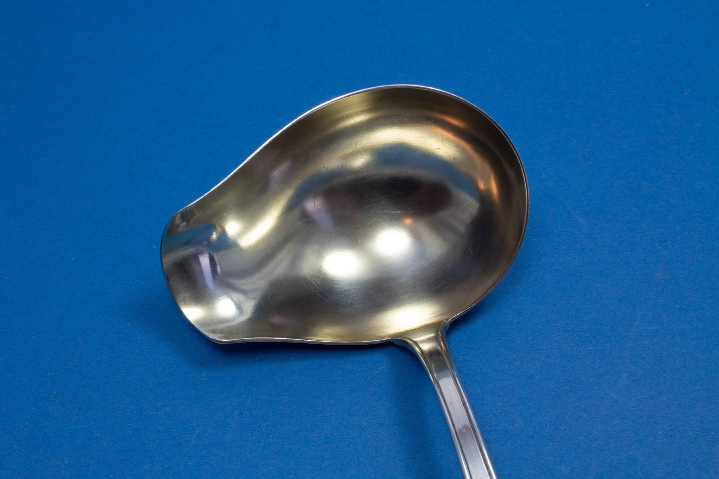Eine versilberte Soßenkelle mit einem hübschen Muster.