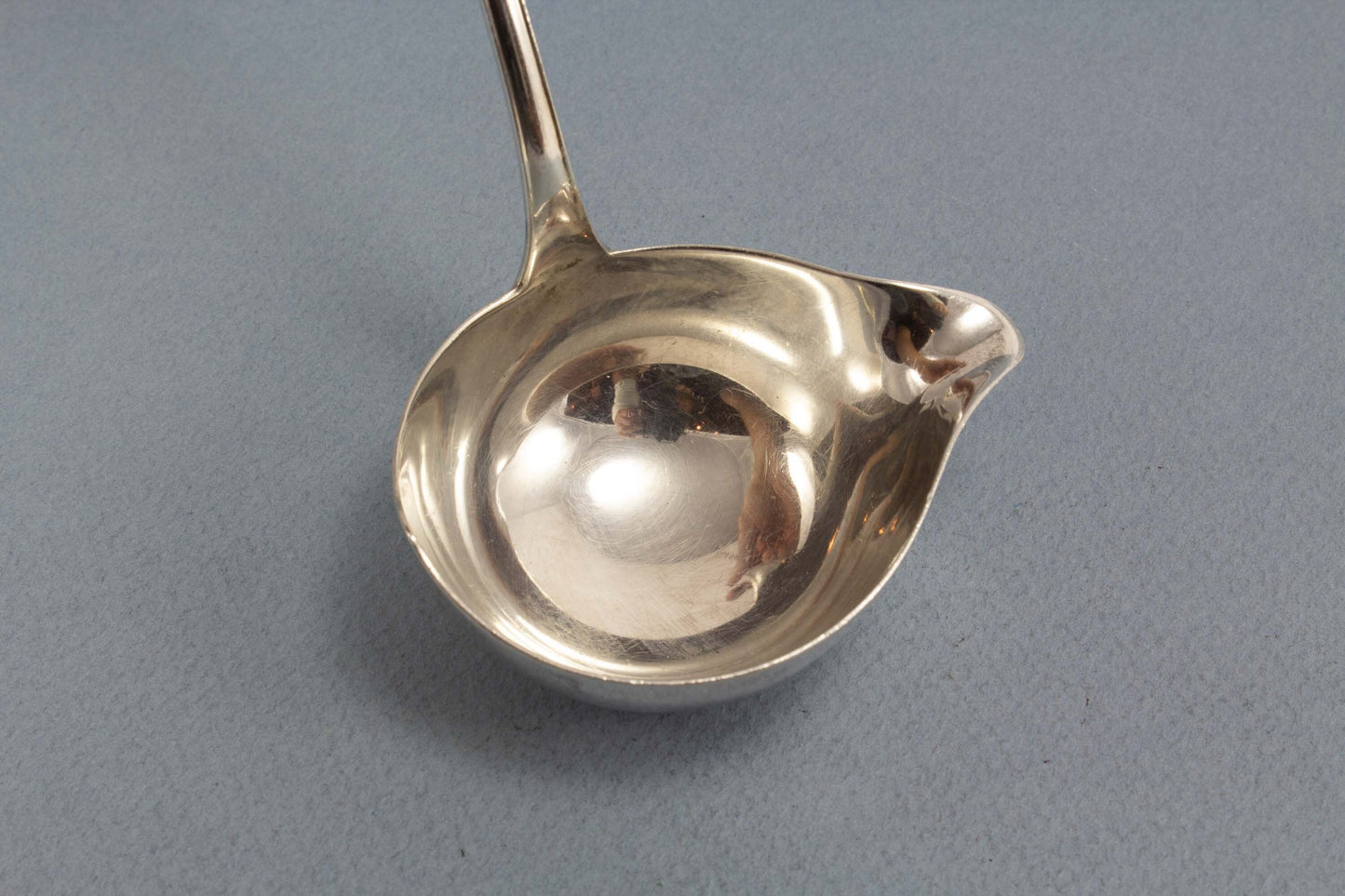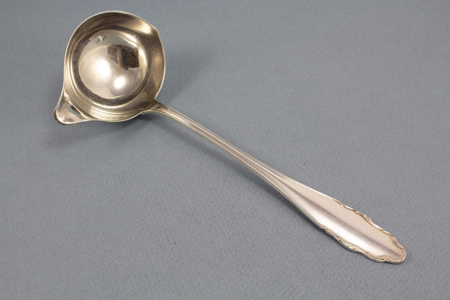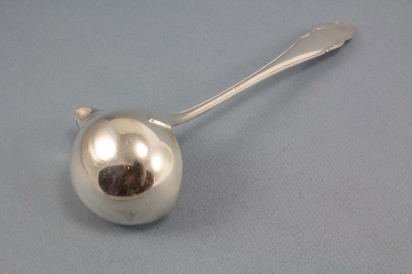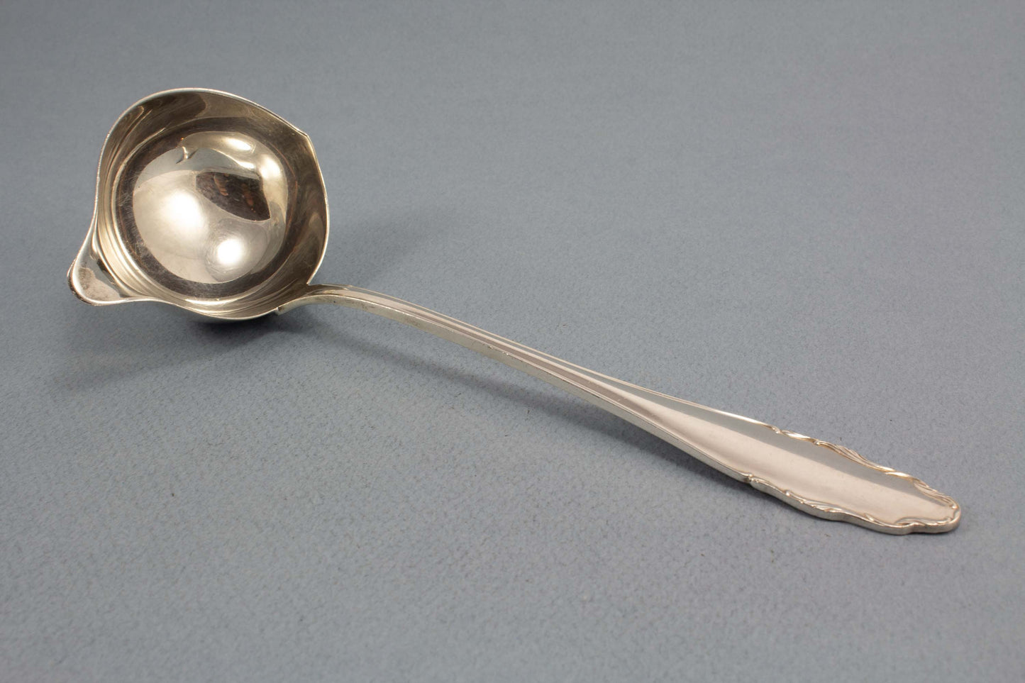 Eine versilberte Soßenkelle mit einem hübschen Muster.