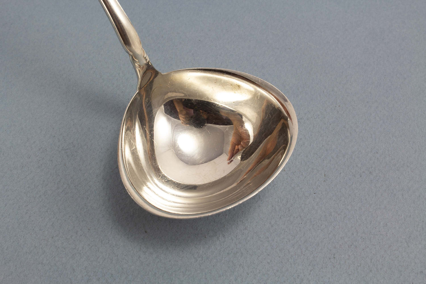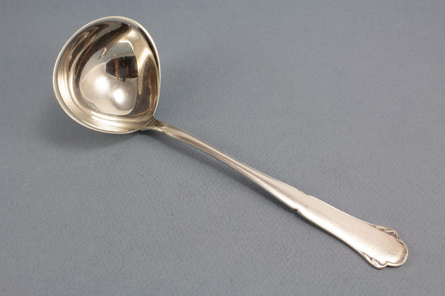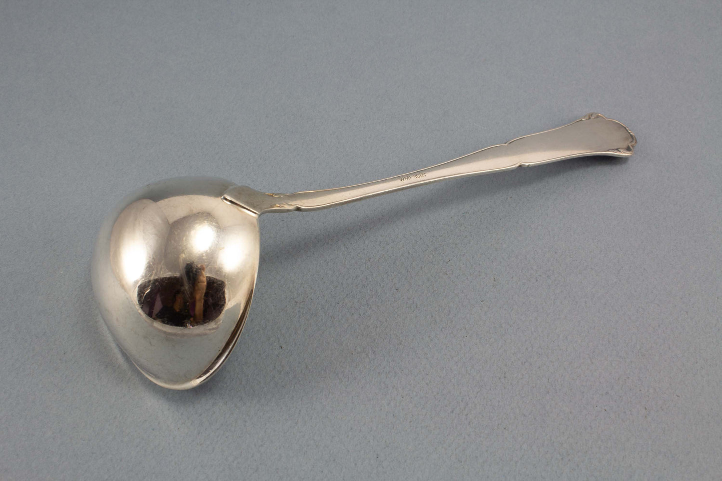 Eine versilberte Soßenkelle mit einem hübschen Muster.