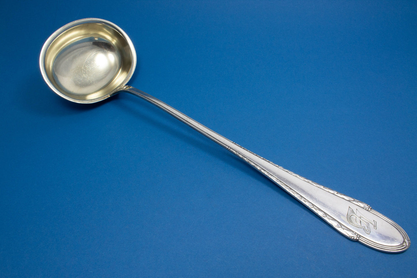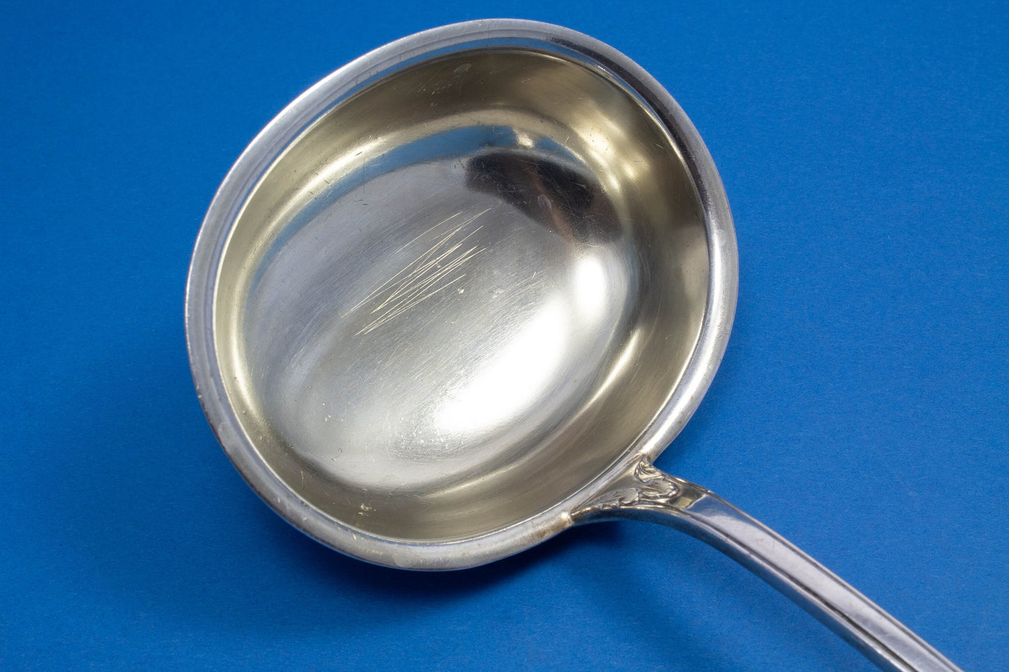 This soup ladle is silver-plated and engraved with "LB". The old trowel is really timeless and something special for friends of beautiful, old things.