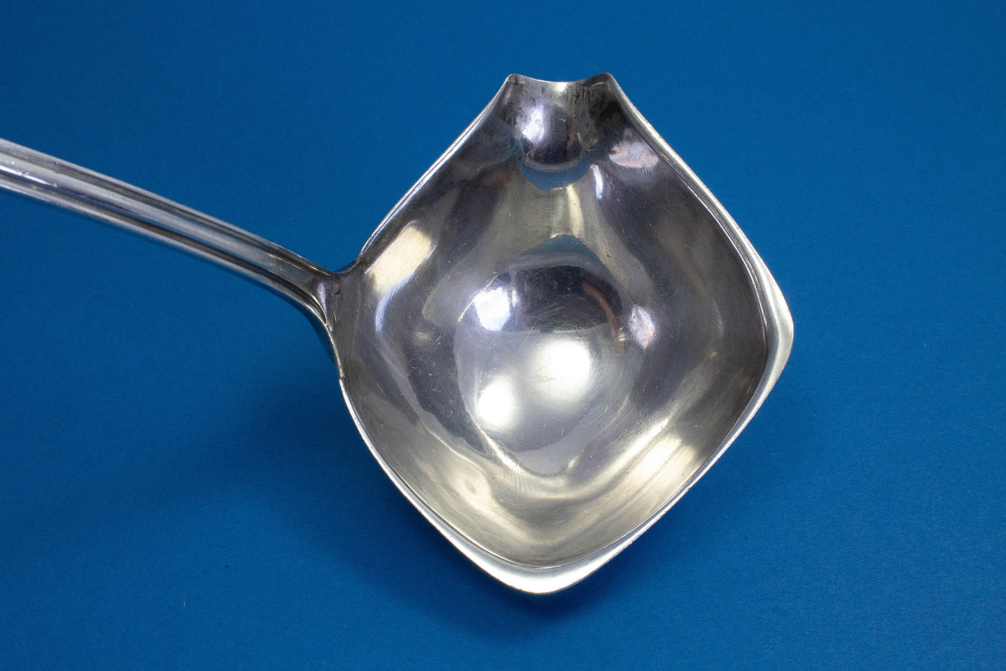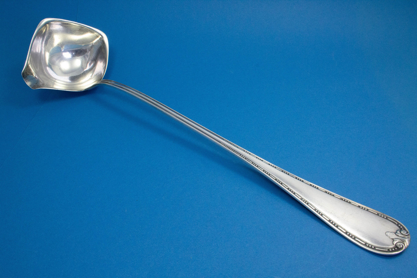 Diese versilberte Suppenkelle zeigt ein hübsches Muster und ist bestens geeignet für große Suppentöpfe.
