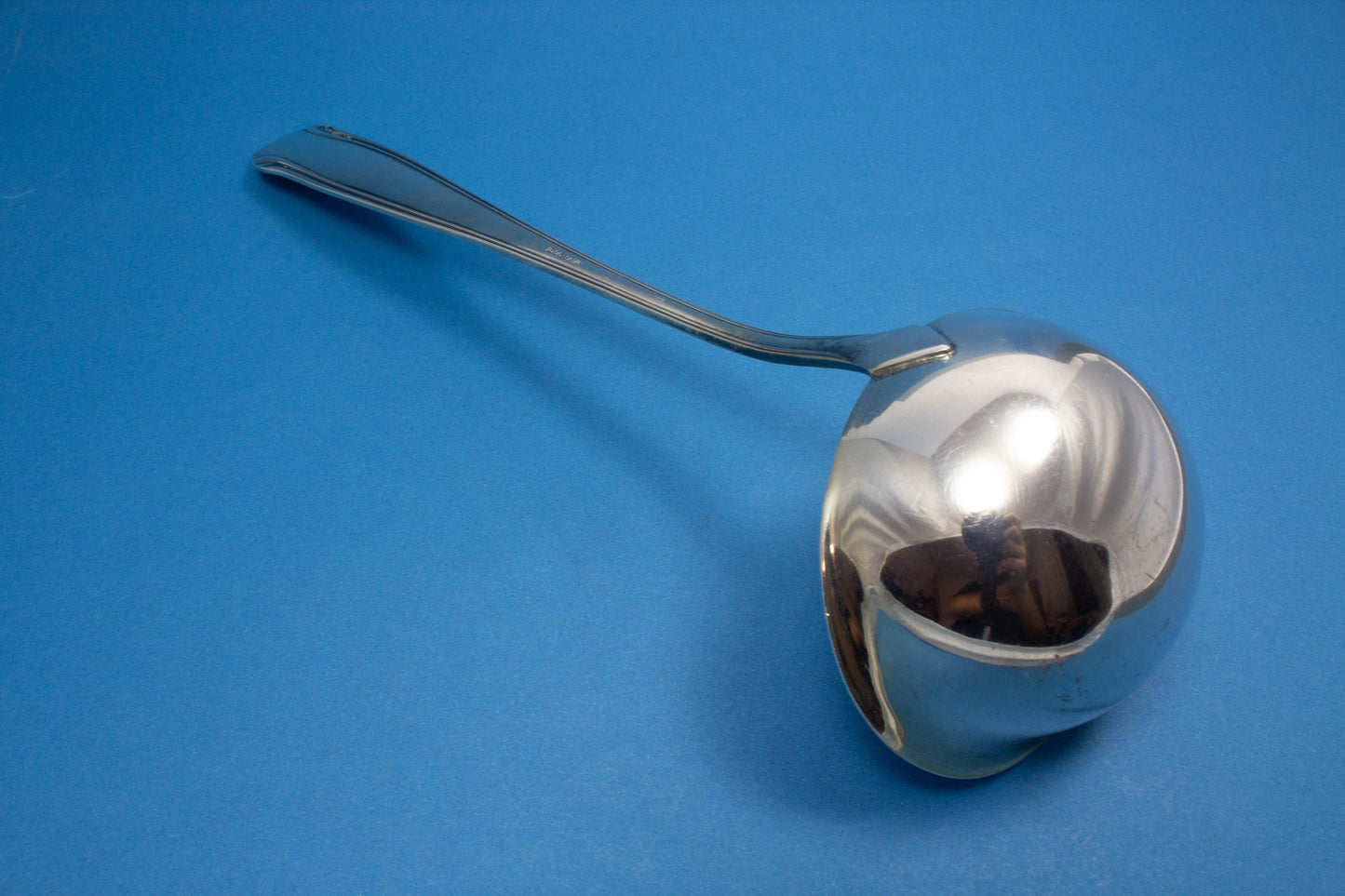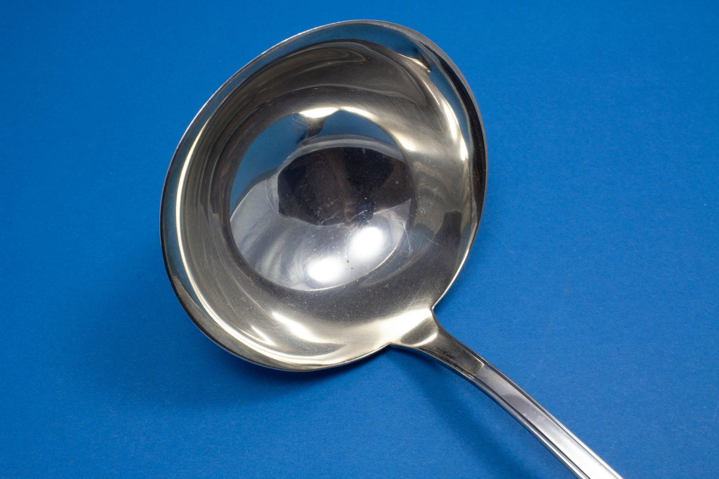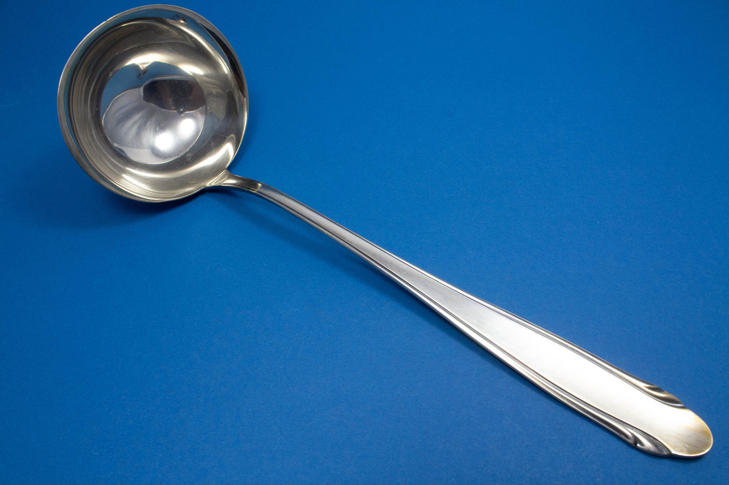 Diese versilberte Suppenkelle zeigt ein hübsches Muster und ist bestens geeignet für große Suppentöpfe.