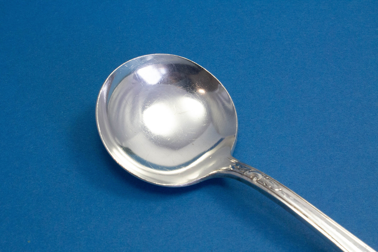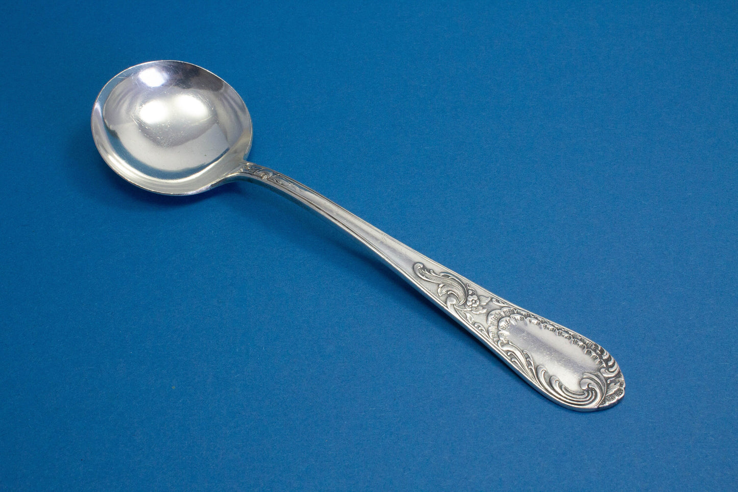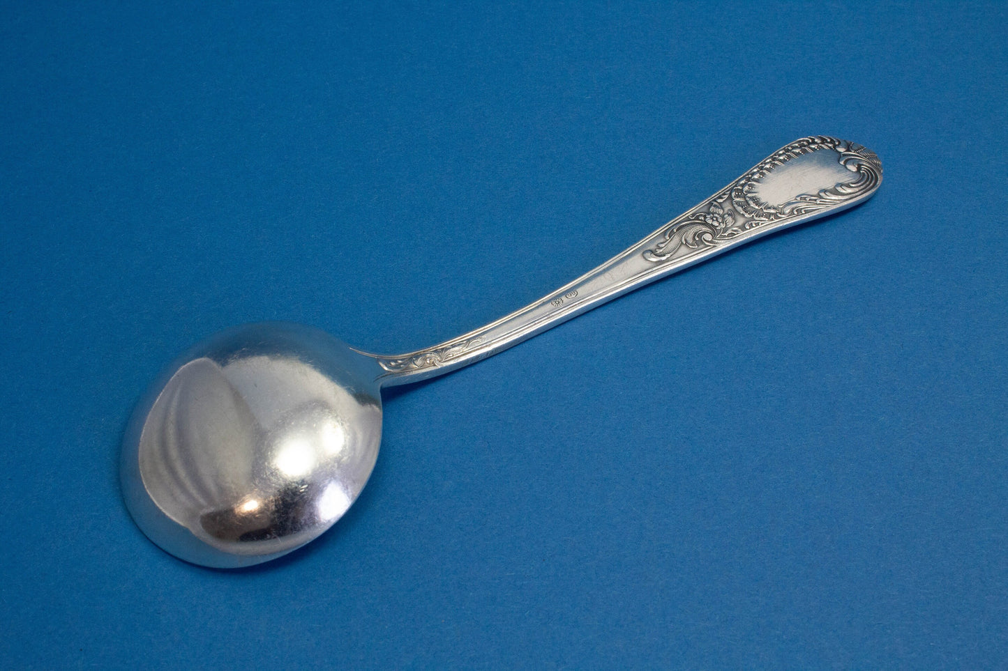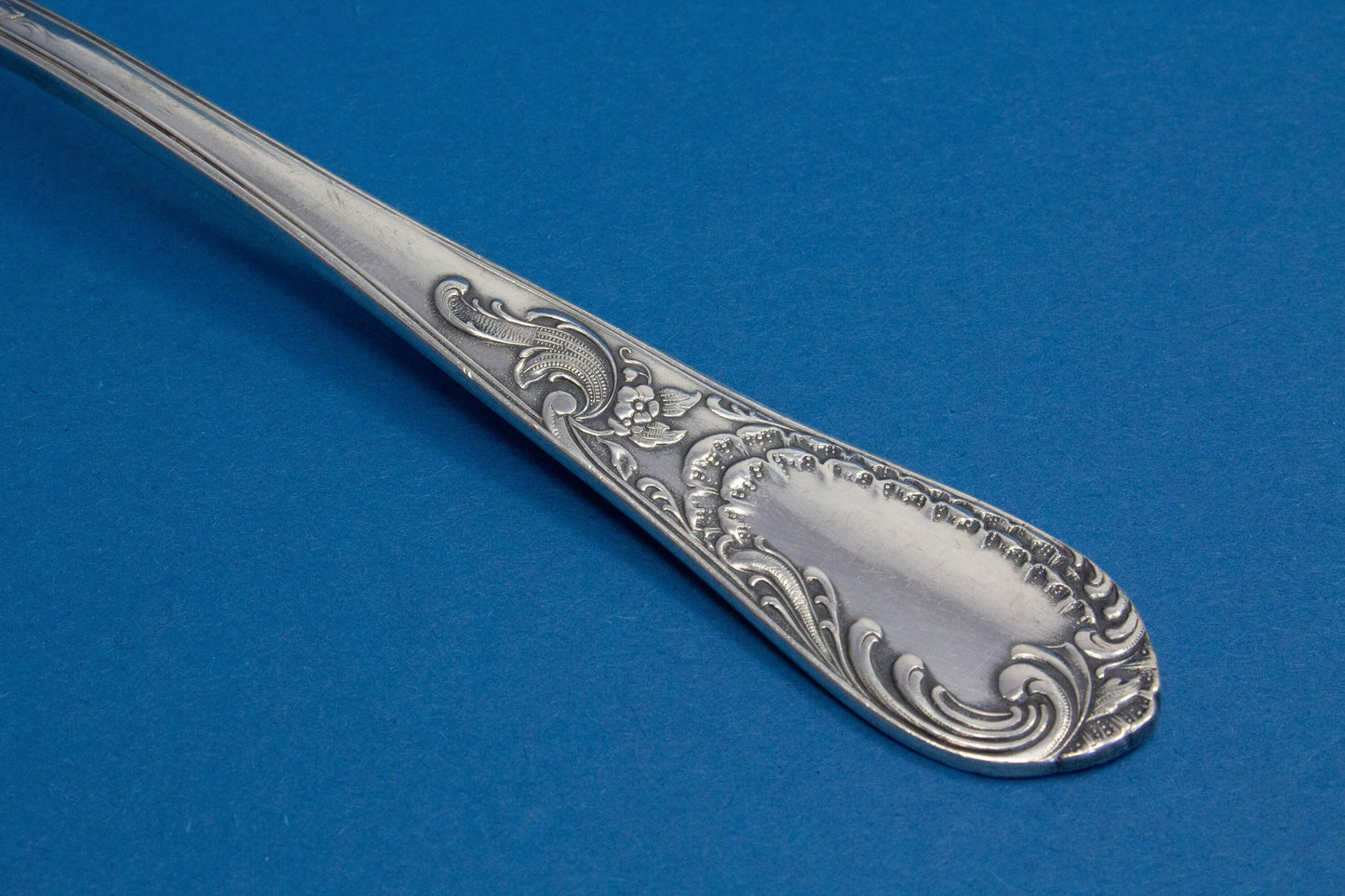 Versilberter Sahnelöffel mit Rokoko-Verzierungen