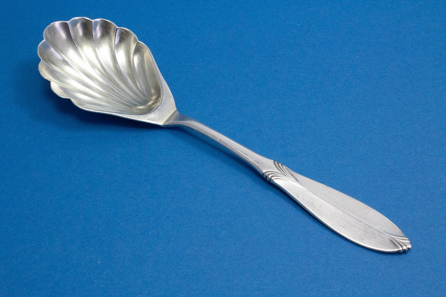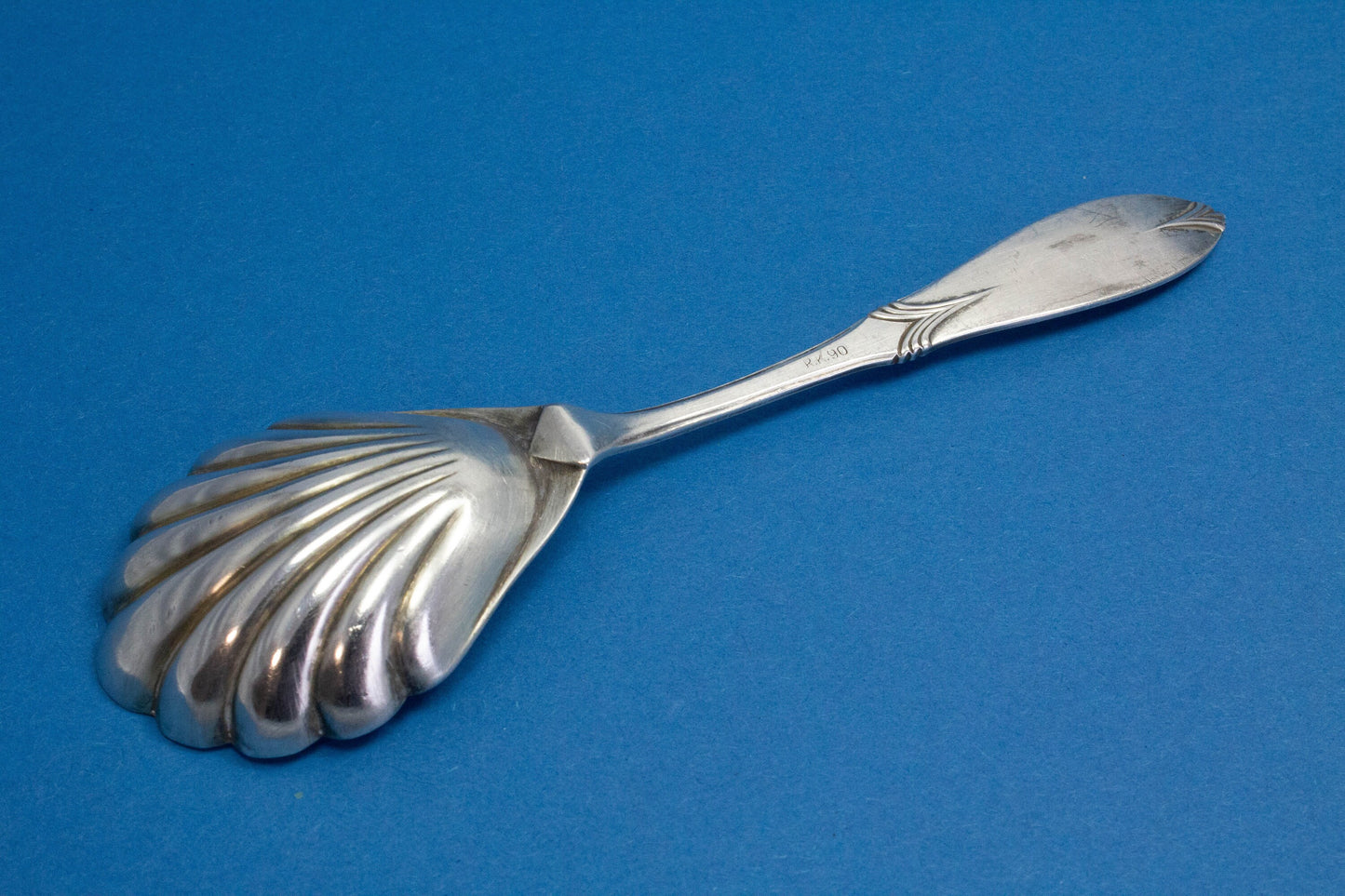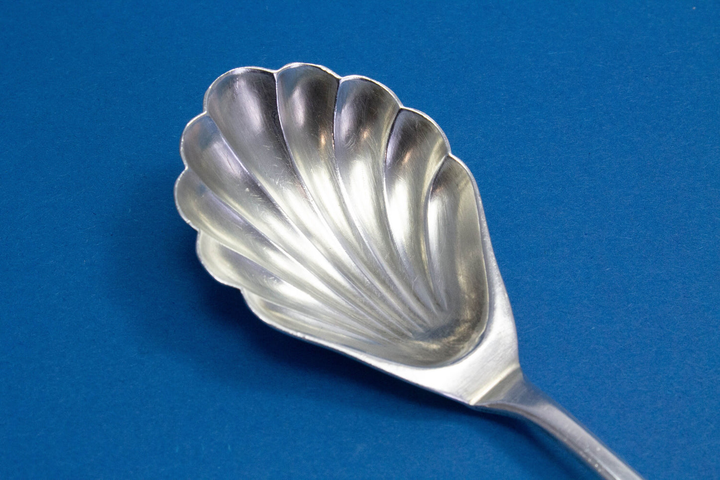 Ein versilberter Zuckerlöffel mit einer muschelförmigen Laffe, die sich ideal zum Servieren von Zucker eignet.