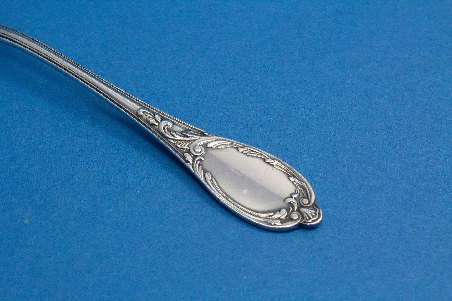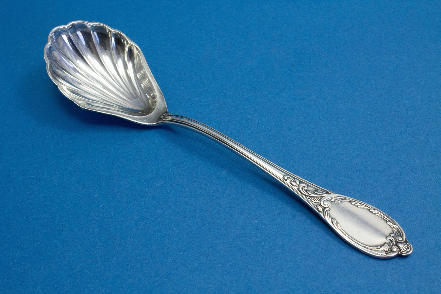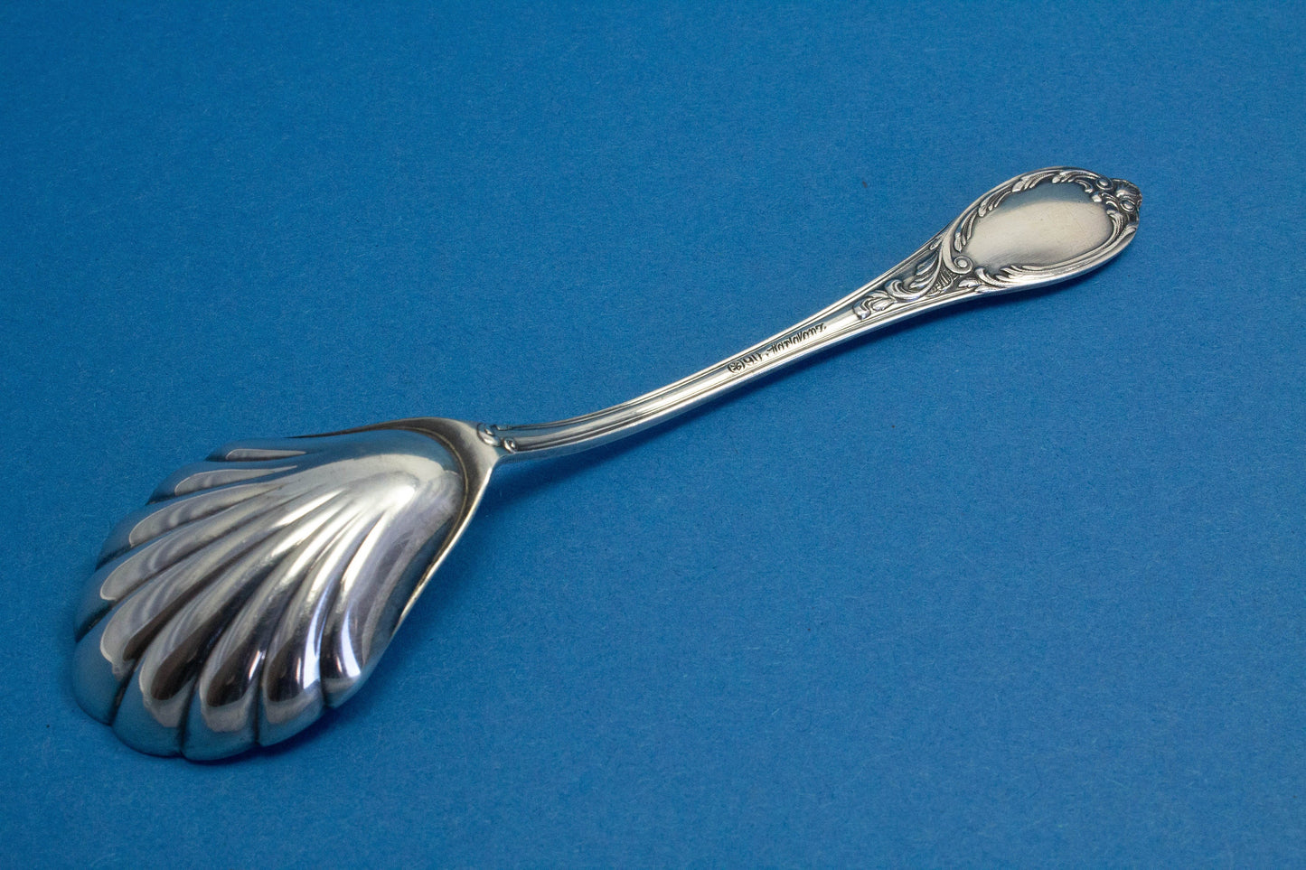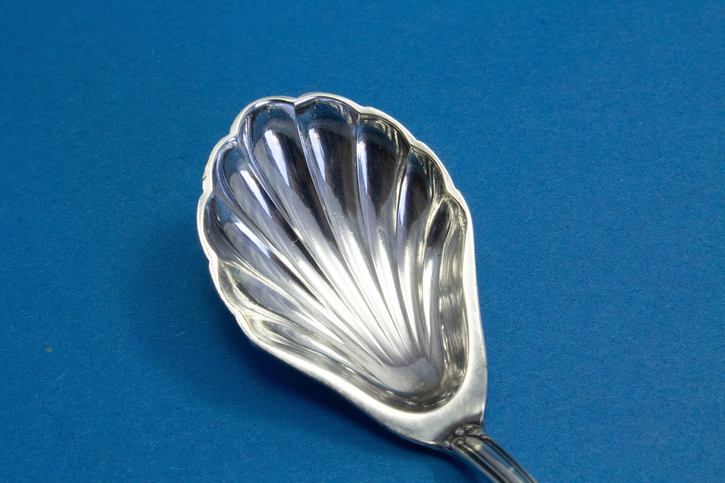 Ein versilberter Zuckerlöffel mit einem muschelförmigen Löffel von Koch und Bergfeld mit einem Rokoko Dekor.
