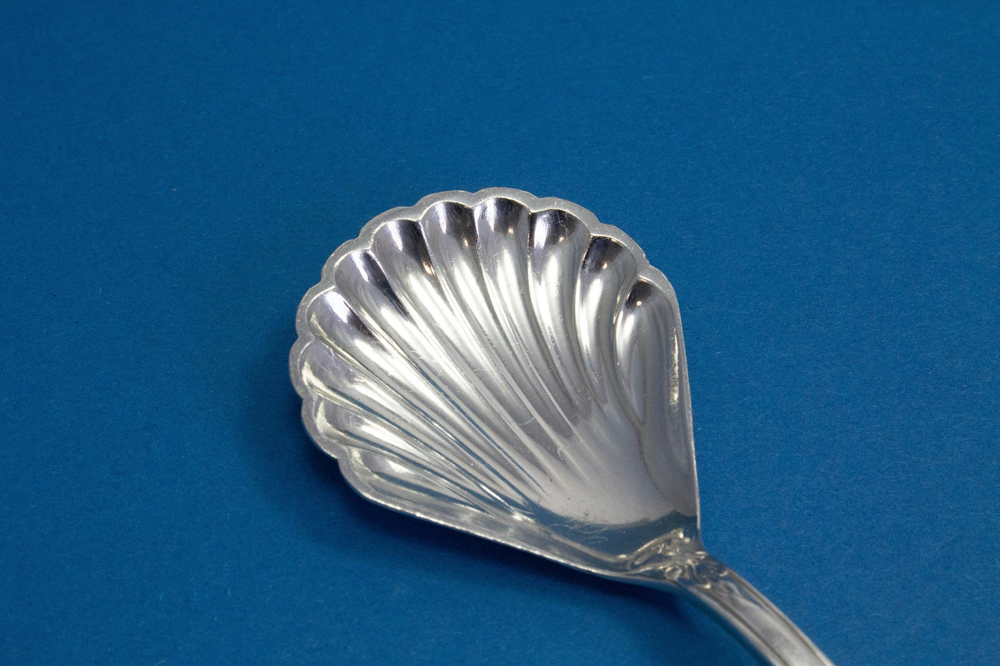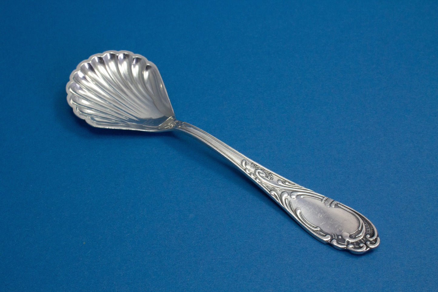 Ein großer, versilberter Zuckerlöffel mit sehr hübschen Rokoko-Verzierungen. Der Löffel hat eine muschelförmige Schale und ist ideal zum streuen von Zucker.