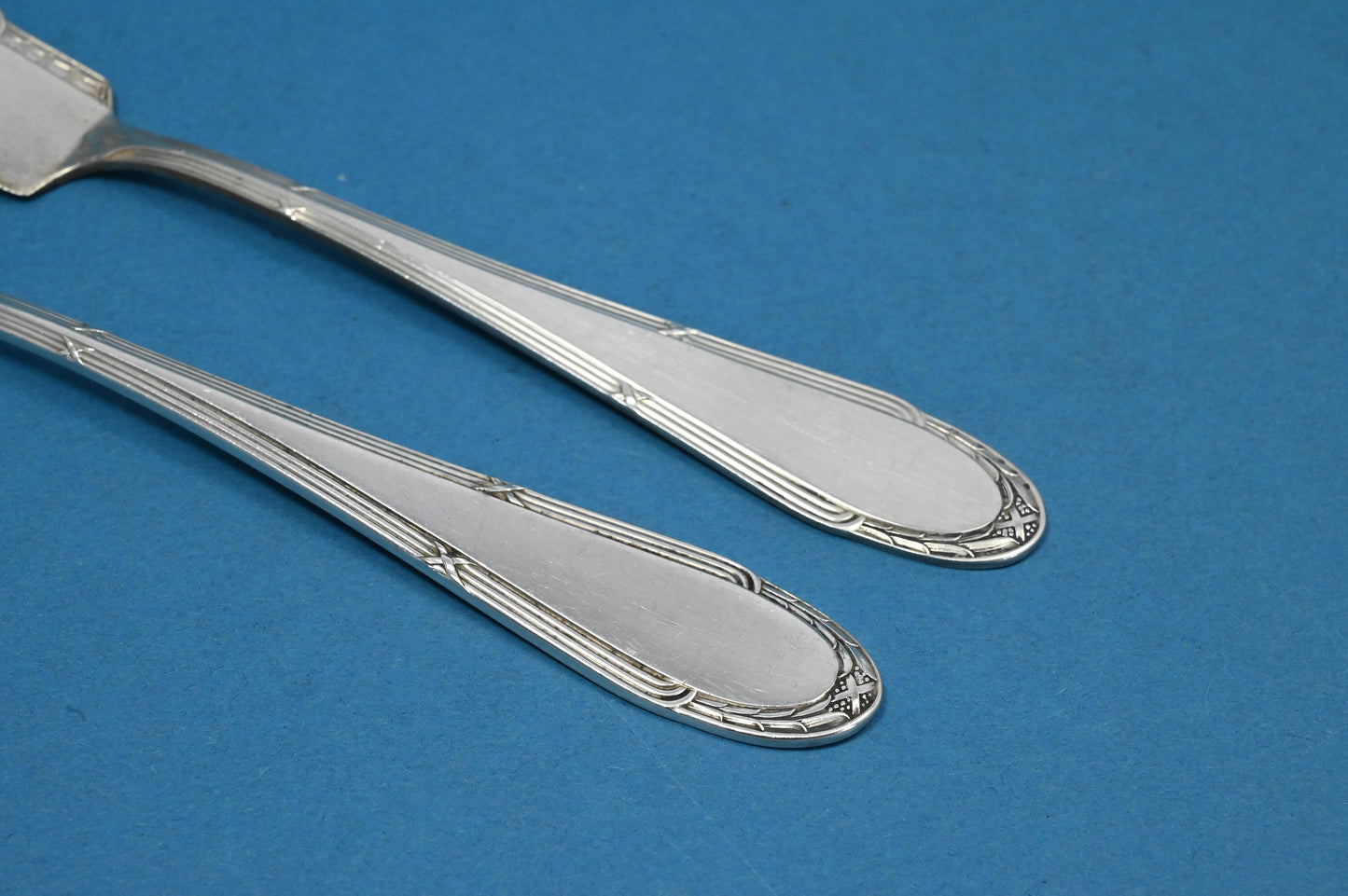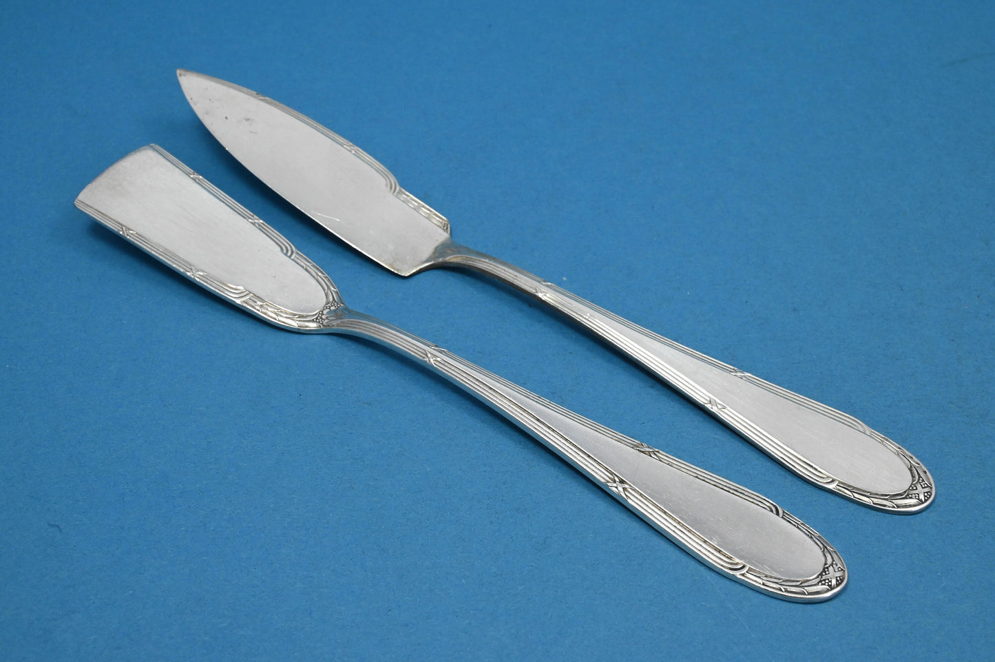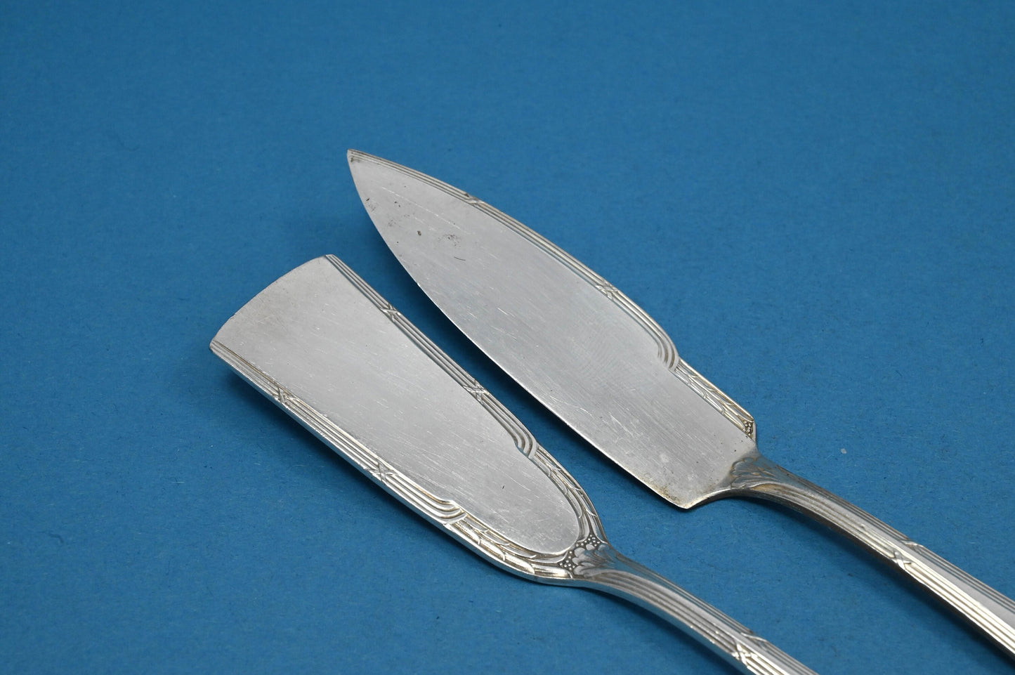 Dieses hübsche Set besteht aus einem Buttermesser und einem Käsemesser. Zwei schöne versilberte Besteckteile für einen Snack, Tapas, Brunch oder ein herzhaftes Frühstück. Vergessene, aber äußerst nützliche Besteckteile im beispielhaften Jugendstildekor gekreuzte Bänder von WMF.