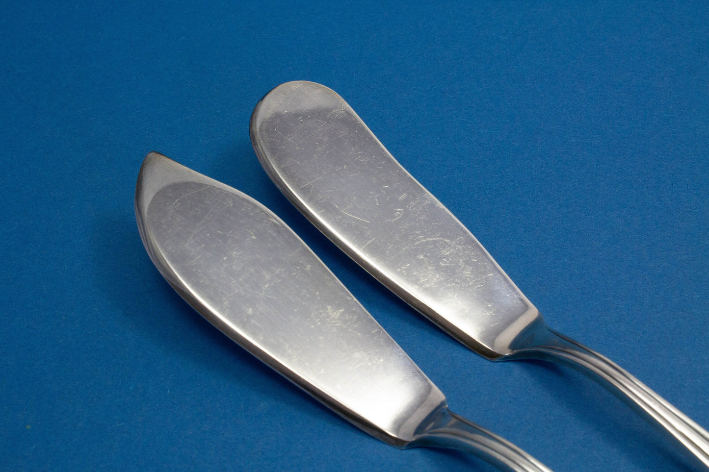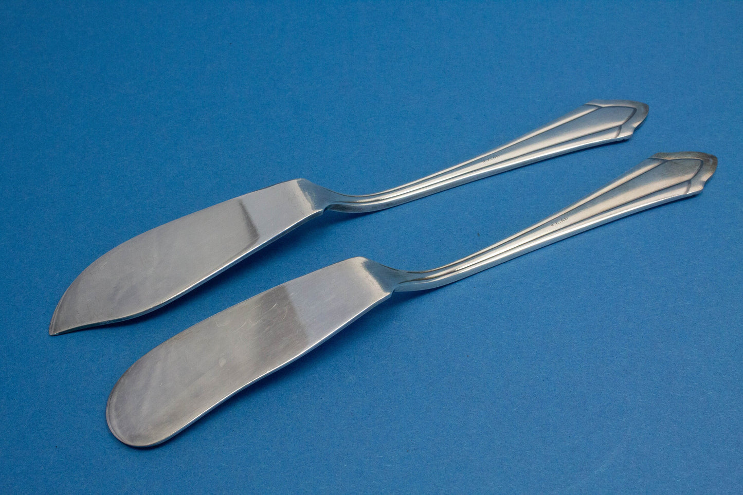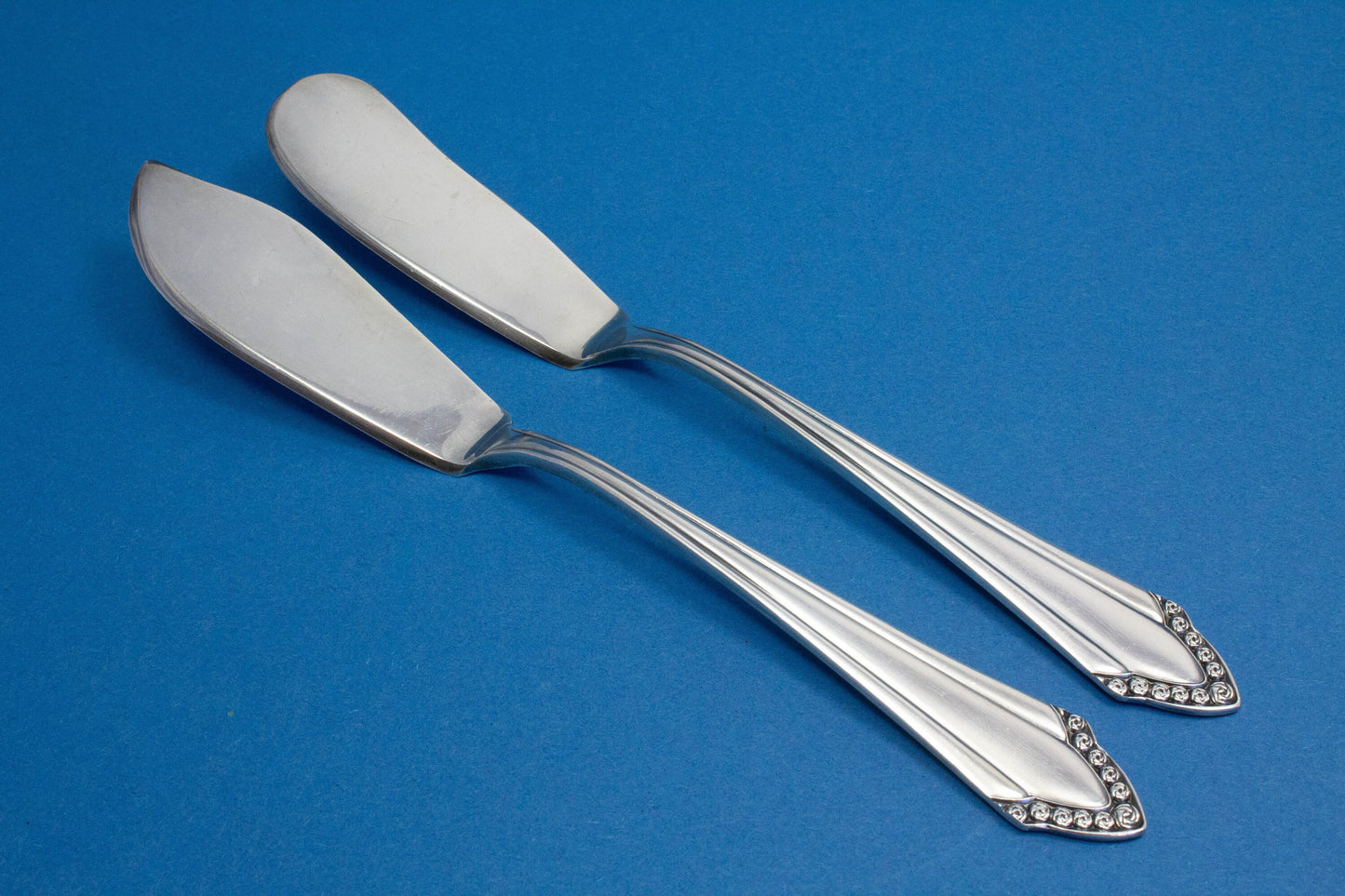 Dieses hübsche Messerset besteht aus einem Buttermesser und einem Käsemesser. Zwei versilberte Besteckteile für einen Snack, Brunch oder ein herzhaftes Frühstück.
