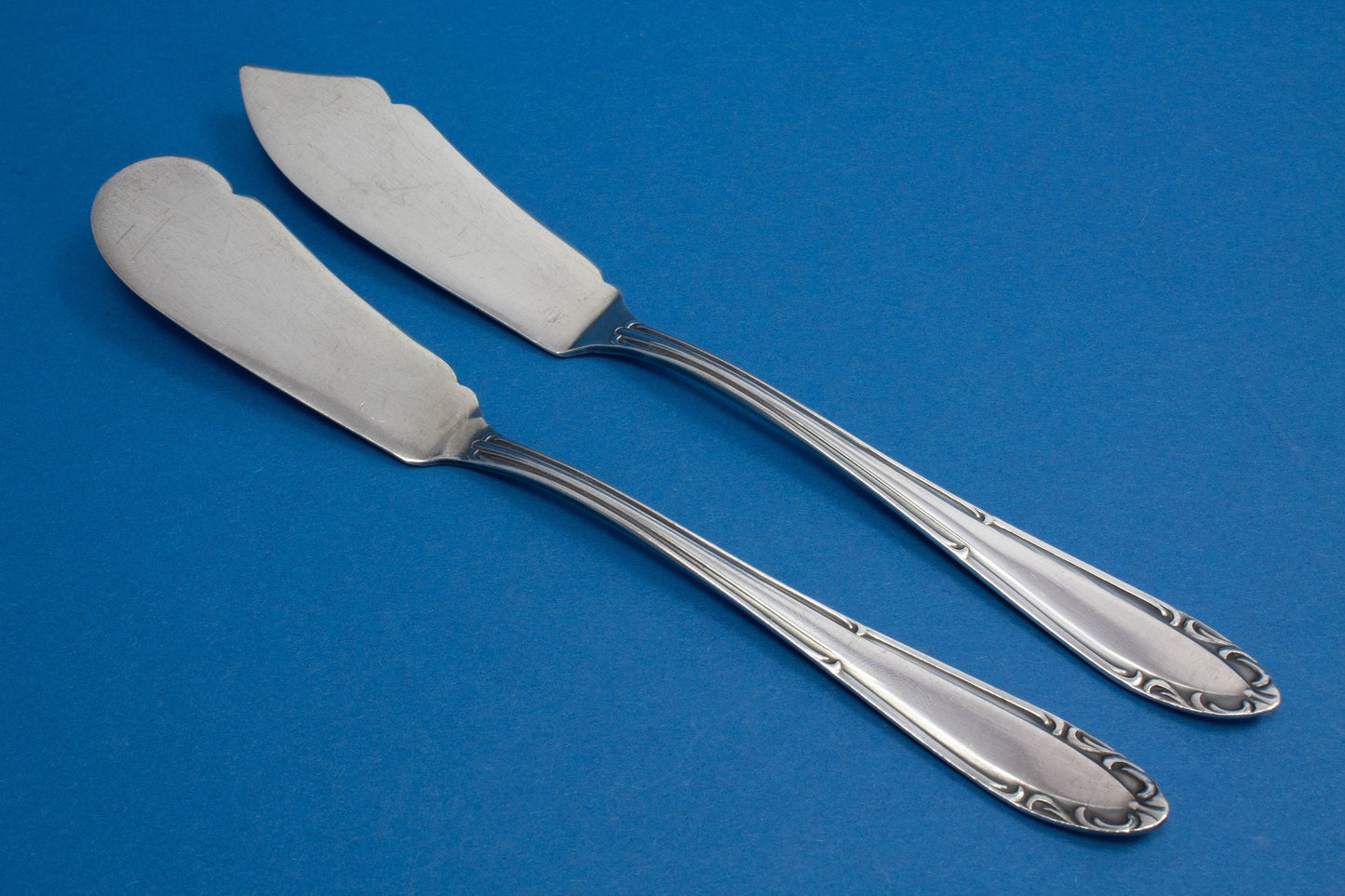 Dieses hübsche Set besteht aus einem Buttermesser und einem Käsemesser. Zwei schöne versilberte Besteckteile für einen Snack, Brunch oder ein herzhaftes Frühstück.