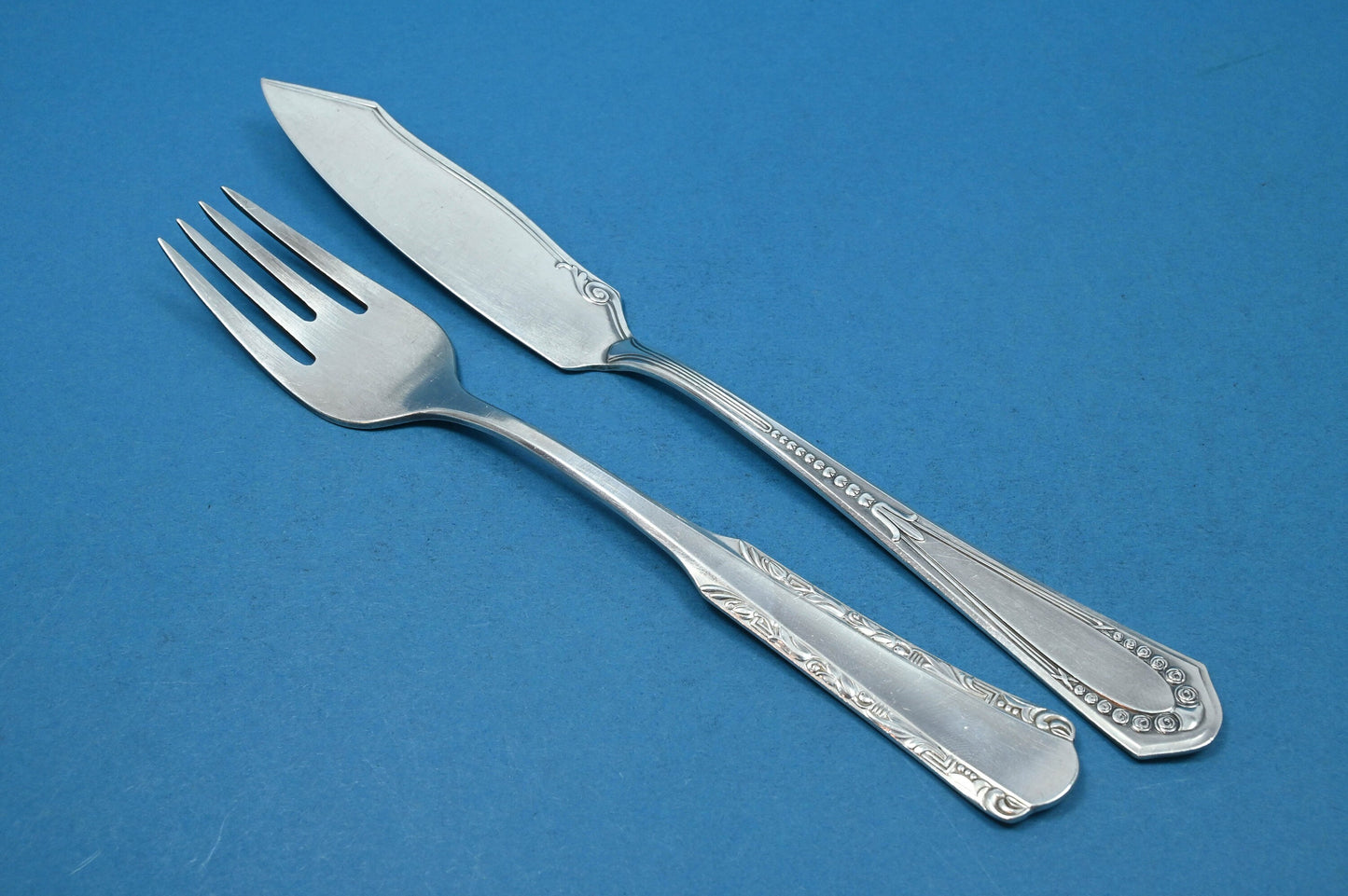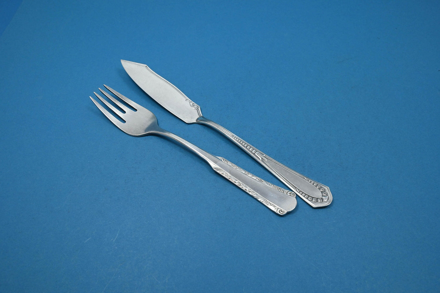 Das Besteck-Set besteht aus einer Fischgabel und einem Fischmesser mit zwei verschiedenen, wunderschönen WMF Dekoren.