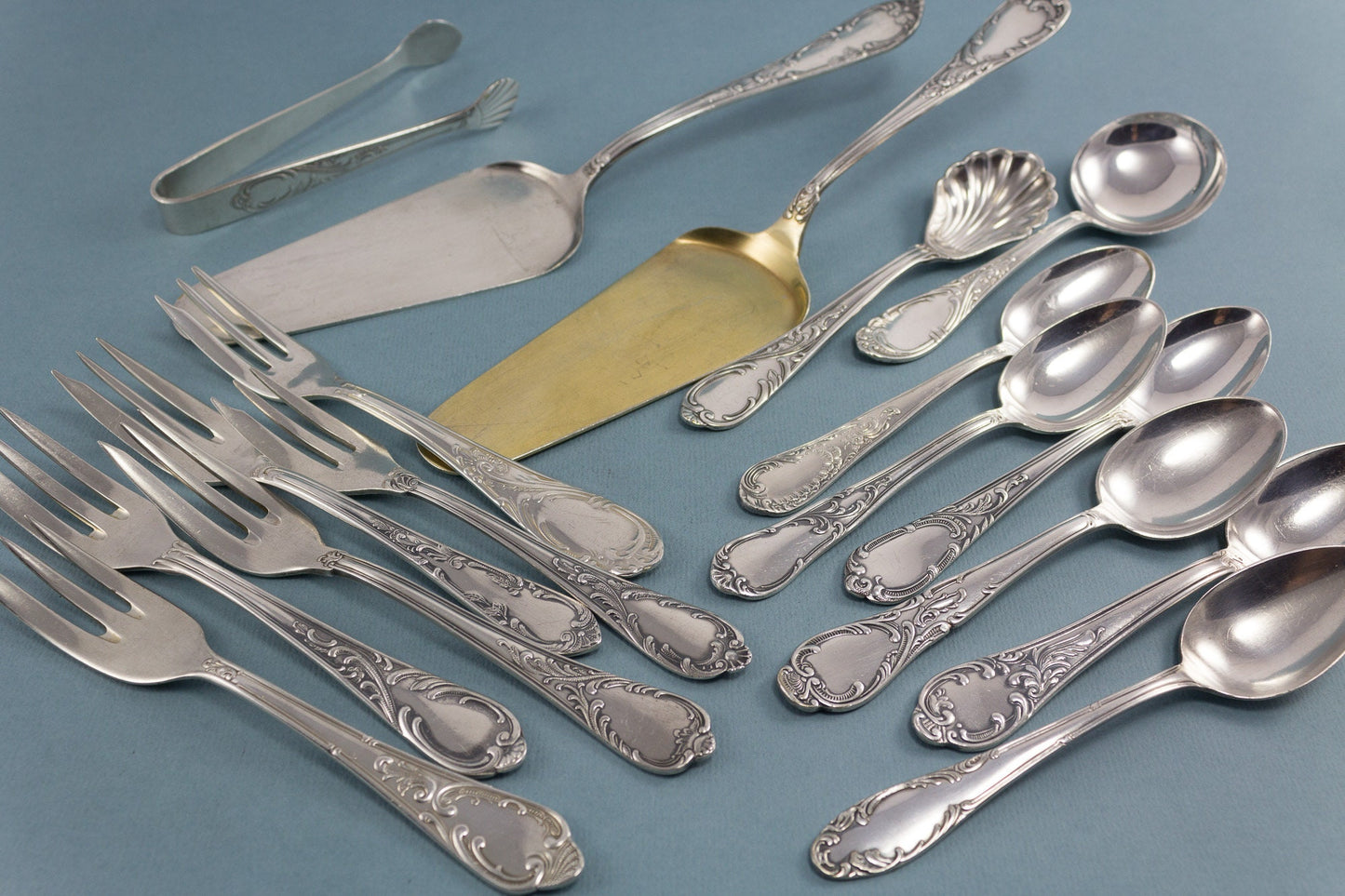 Ein 17-teiliges Besteckset für sechs Personen. Das Set besteht aus sechs Kuchengabeln, sechs Teelöffeln, einer Zuckerzange, einem Sahnelöffel, einem Zuckerlöffel und zwei Tortenhebern. Alle Besteckteile haben unterschiedliche Rokoko-Muster und sind hochwertig versilbert.