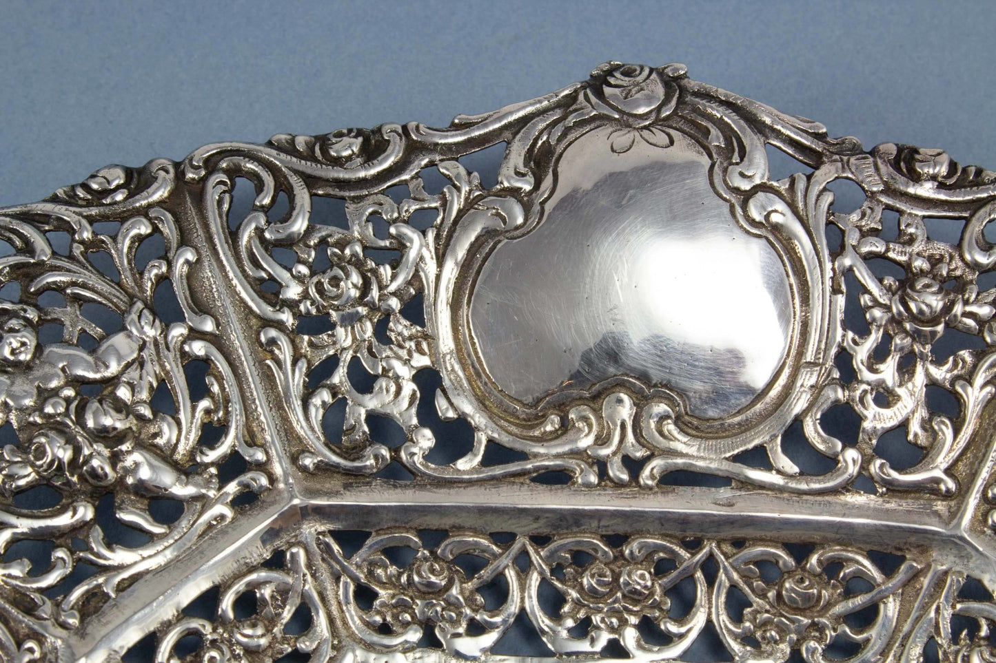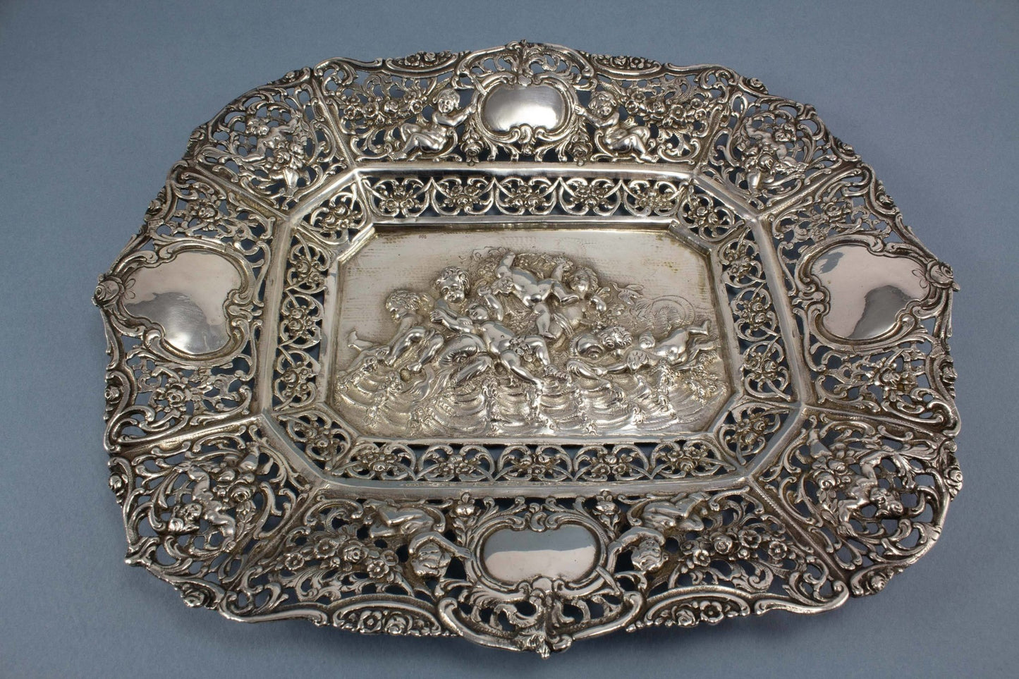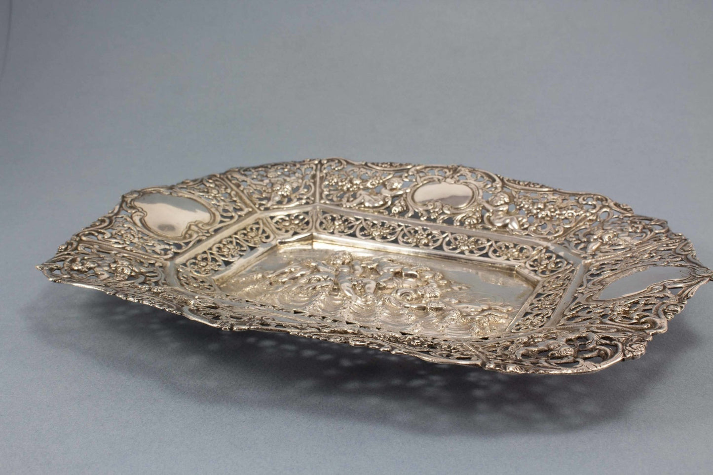 Eine wunderschöne, antike Schale aus 800 er Silber mit Putti und Delfin im Meer. Der Rand ist mehrfach durchbrochen und mit den opulenten Blumengirlanden und weiteren Putten ist die kleine Schale sehr eindrucksvoll. Die Schale eignet sich hervorragend zum Anbieten kleiner Köstlichkeiten. Ein seltenes wunderschönes Vintage Stück zum Verlieben und immer wieder Anschauen!