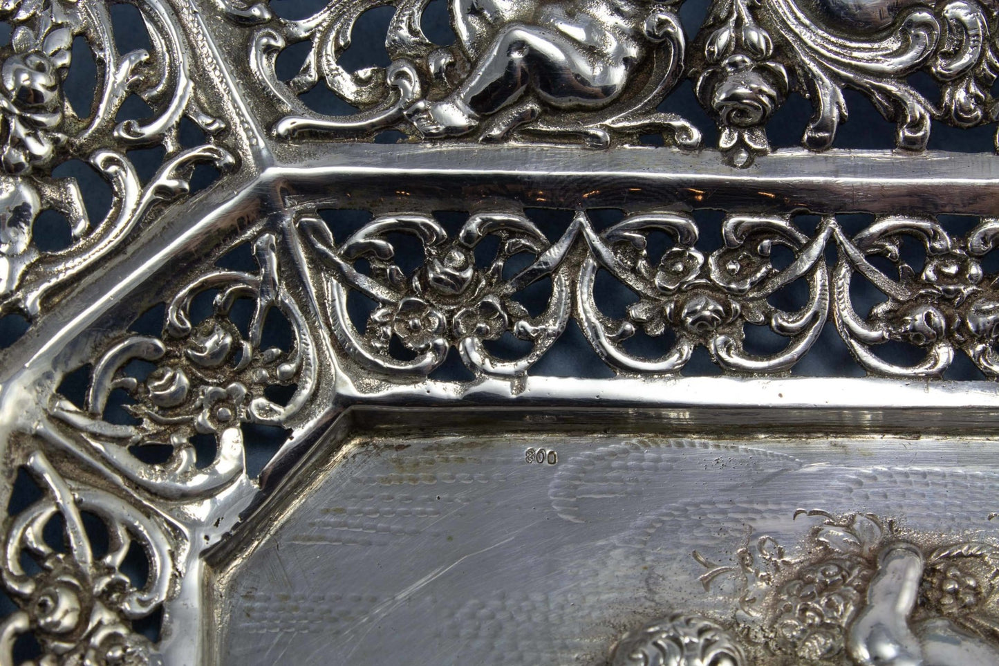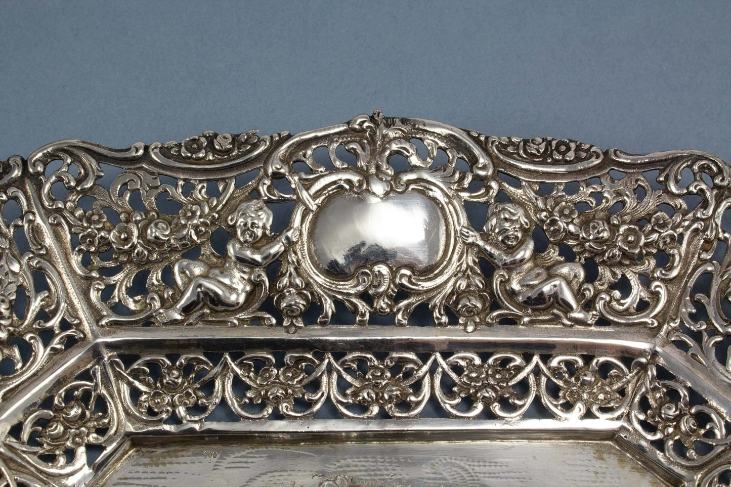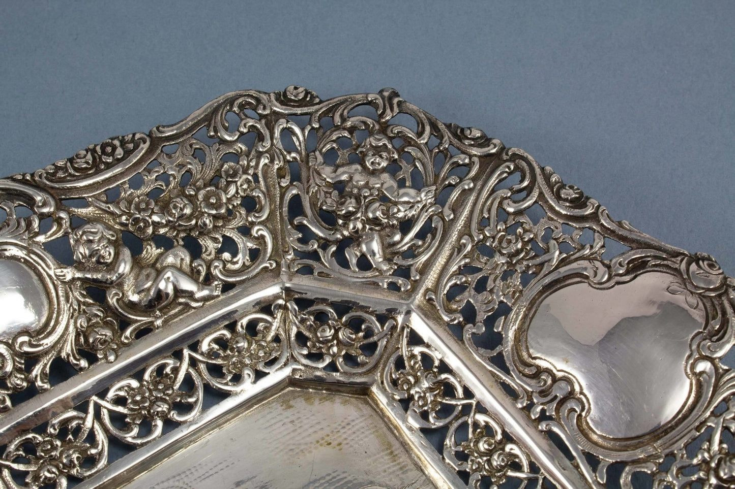 Eine wunderschöne, antike Schale aus 800 er Silber mit Putti und Delfin im Meer. Der Rand ist mehrfach durchbrochen und mit den opulenten Blumengirlanden und weiteren Putten ist die kleine Schale sehr eindrucksvoll. Die Schale eignet sich hervorragend zum Anbieten kleiner Köstlichkeiten. Ein seltenes wunderschönes Vintage Stück zum Verlieben und immer wieder Anschauen!